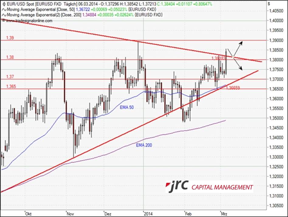 Jannis Raftopoulos gibt im heutigen Wochenausblick einen Ausblick auf die kommende Handelswoche.Fundamentaler AusblickNach dem jüngsten EZB-Leitzinsentscheid und der anschließenden Pressekonferenz könnte sich das Chart-Bild des EUR/USD nachhaltig verändern.Bis zum Donnerstag, den 13.03.2014 werden überwiegend Konjunkturnachrichten aus der Eurozone veröffentlicht. Hervorzuheben sind dabei die deutsche Handelsbilanz am Dienstag, den 11.03. sowie die europäische Industrieproduktion am Mittwoch, den 12.03. Zum Ende der Woche hin werden die US-Einzelhandelsumsatzzahlen veröffentlicht. Nach -0,4 Prozent zuvor wird für den Februar ein Plus von 0,2 Prozent erwartet. Außerdem stehen am Donnerstag, den 13.03. die wöchentlichen Erstanträge auf Arbeitslosenhilfe in den USA an. Am letzten Tag der Handelswoche folgen die Verbraucherpreisindizes für Deutschland und die Eurozone, bei denen keine Veränderung erwartet wird. Zum Wochenschluss wird der Index für das Verbrauchervertrauen der University of Michigan veröffentlicht, der die Konsumneigung der US-Privathaushalte widerspiegelt. Auch hier wird nach einem Stand von zuvor 81,6 Punkten keine Veränderung erwartet. Technische AnalyseDer EUR/USD hat die obere Abwärtstrendlinie am Donnerstag durchbrochen. Kann der EUR/USD dieses Hoch behaupten und fällt er nicht unter 1,3810, so sind weitere Kursanstiege nicht ausgeschlossen.Hier geht es zum ChartFalls der EUR/USD das aktuelle Kursniveau behaupten kann, liegen die Kursziele bei 1,3850 und 1,3900 Pips. Im anhaltenden Aufwärtstrend wären kleine Kursrücksetzer bis 1,3810 marktüblich. Von hier aus wären erneute Aufwärtsbewegungen sehr wahrscheinlich.Fällt der Kurs signifikant unter die Unterstützung bei 1,3810 Pips, so sind weitere Kursrücksetzer zu erwarten. Erste Unterstützungen befinden sich bei 1,3750 beziehungsweise bei der unteren Aufwärtstrendlinie. Sollte der EUR/USD deutlich unter das lokale Tief bei 1,3650 Pips fallen, so wäre ein Trendwechsel sehr wahrscheinlich. von Jannis Raftopoulos, CEO JRC Capital Management