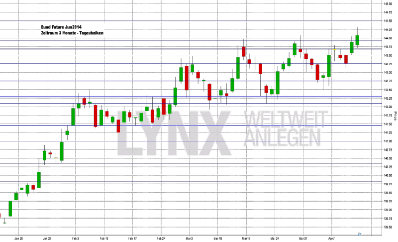 Bis auf einen kurzen Moment am Mittwoch konnte der Bund-Future seinen Verlauf oberhalb der Marke 143,30 fortsetzen und erreichte das Wochenziel von etwas mehr als 144,00 Zählern. Der Schlusskurs vom Freitagabend lag dann knapp über der Marke 144,00, was als recht stark einzustufen ist. Der Bund-Future kämpft sich nun Stück für Stück nach oben, was generell als Aufwärtstrend zu werten ist. Es ließ sich jedoch in den vergangenen Wochen beobachten, dass nach neuen Hochs immer wieder Abverkäufe von rund 150 Ticks stattfanden. Diese Beobachtung deutet möglicherweise auf eine Abschwächung des Aufwärtstrends hin. Jetzt kann man nur abwarten. Kurse oberhalb der Marke 143,70 gelten als weiterhin long und könnten für Trades genutzt werden. Bei einem Rutsch unter diese Marke könnte jedoch eine Bewegung in Richtung 142,75 einsetzten. Oberhalb von 143,70 könnten also vorsichtig Long- und unterhalb Short-Einstiege gesucht werden.