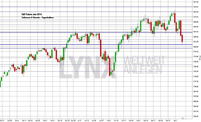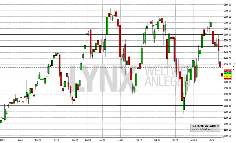 In der abgelaufenen Handelswoche überwogen die Kursverluste. Der deutsche Leitindex DAX gab auf Wochensicht 3,92 Prozent ab und schloss mit einem Punktestand von 9.315,29. Der XDAX stand um 22:00 Uhr mit 9.266 Punkten nochmals deutlich tiefer. An der Wall Street ging der Dow Jones mit 16.026,75 Punkten und einem Wochenminus von 2,35 Prozent aus dem Handel. Der NASDAQ 100 ging mit 3.446,845 Punkten in das Wochenende – eine Wochenbilanz von –2,61 Prozent. Der NASDAQ Composite schaffte den Sprung zurück über die 4.000-Punkte-Marke nicht mehr und beendete die Woche mit 3.999,734 Punkten. Der Wochenverlust lag hier bei 3,10 Prozent. Der breit gefasste S&P 500 ging mit 1.815,69 Zählern aus dem Handel – einem Wochenminus von 2,65 Prozent. Besonders heftig waren die Abgaben beim japanischen Leitindex NIKKEI 225, der auf Wochensicht 7,33 Prozent einbüßte und nun bei 13.960,05 Punkten steht. Die europäische Gemeinschaftswährung Euro konnte sich über die Handelswoche behaupten und schloss mit 1,3884 US-Dollar. Der Preis für eine Feinunze Gold betrug zum Wochenschluss 1.317,40 US-Dollar. Rohöl der Nordseesorte Brent verbilligte sich auf 107,207 US-Dollar das Fass. Der Euro-Bund-Future stieg wieder deutlich an und notierte an der EUREX zum Schluss mit 144,24 Zählern. Die Rendite für zehnjährige Bundesanleihen fiel auf 1,50 Prozent. Am Mittwoch, den 16.04. steht eine Auktion der Finanzagentur des Bundes im Fokus der Anleger. Der Bund emittiert eine zehnjährige Bundesanleihe mit einem Auktionsvolumen von 4 Mrd. Euro. Es handelt sich um eine Aufstockung. Die Laufzeit geht bis zum 15.02.2024.