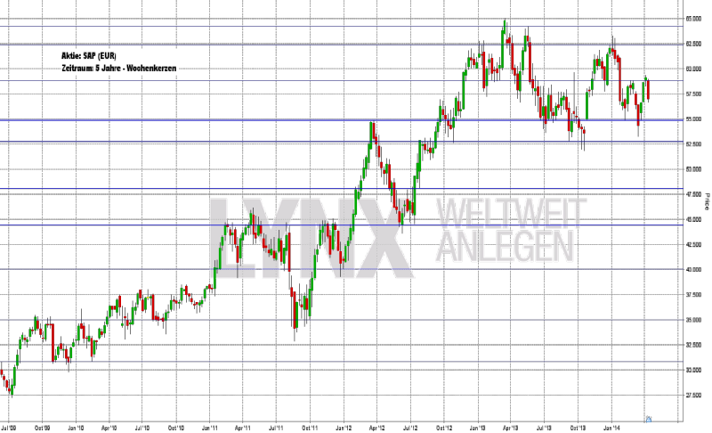 Vorstandsvorsitzender von SAP ist Dr. Werner Brandt, Vorsitzender des Aufsichtsrates Gründer Prof. Hasso Plattner. Gemäß der Bilanz zum Stichtag 31.12.2013 hat die SAP AG einen Gesamtumsatz von 16,8 Mrd. Euro erzielt. Seit Jahren zeigen die Zahlen aufwärts (2009 hatte der Umsatz erst 10,7 Mrd. Euro betragen). Das Ergebnis der gewerblichen Geschäftstätigkeit lag bei 4,4 Mrd. Euro. Das Zinsergebnis bei –85,0 Mio. Euro. Insgesamt ergab dies einen Jahresüberschuss in Höhe von 3,3 Mrd. Euro. Nur 2011 lag der Jahresüberschuss mit 3,4 Mrd. Euro leicht darüber. 2009 etwa hatte er nur 1,7 Mrd. Euro, 2012 2,8 Mrd. Euro betragen. Das Ergebnis je Aktie belief sich demnach auf 3,37 Euro netto. Die Dividende wuchs in den letzten Jahren stetig. 2009 hatte sie noch 0,50 Euro betragen, für 2013 bereits 1,00 Euro. SAP hatte zum Bilanzstichtag 66.572 Mitarbeiter. Der Konzern verfügt über 2,7 Mrd. Euro an liquiden Mittel, ein wirtschaftliches Eigenkapital von 14,8 Mrd. Euro, gezeichnetes Kapital von 1,2 Mrd. Euro, Verbindlichkeiten in Höhe von 8,5 Mrd. Euro. Die Bilanzsumme beträgt 27,1 Mrd. Euro. Die Bilanzprognosen weisen gemäß Schätzungen für 2014 einen Gesamtumsatz von 17,80 Mrd. Euro aus und für 2015 18,99 Mrd. Euro. Das EBIT für 2014 soll demnach bei 5,87 Mrd. Euro liegen, das für 2015 bei 6,35 Mrd. Euro. Der Gewinn je Aktie für 2014 wird auf 3,5149 Euro taxiert, für 2015 soll er 3,81 Euro betragen. Folglich könnte sich eine erhöhte Dividende daraus ergeben. Für 2014 werden 1,05 Euro und für 2015 1,15 Euro je Aktie geschätzt. Für 2013 noch eine Nettoverschuldung ausweisend (1,53 Mrd. Euro), soll der Nettogeldbestand 2014 schon bei 1,03 Mrd. Euro liegen und für 2015 sogar 3,84 Mrd. Euro betragen. Diese Kennzahlen allein machen noch keinen Sommer, jedoch könnten sie längerfristig für ein Engagement in SAP sprechen. In jüngster Zeit sind vor allem Technologiewerte an der NASDAQ kräftig abgestraft worden. Auch SAP konnte sich diesem Trend nicht entziehen. In der neuen Woche legen aus dem Technologiesektor neben Google und Yahoo auch weitere Titel wie SanDisk, Intel und andere ihre neuesten Quartalszahlen vor. Am 17.04. veröffentlicht SAP sein ausführliches Zahlenwerk. Man wird genau hinsehen müssen, inwieweit die Walldorfer ihre Prognosen bestätigen können und vor allem, wie sich das Geschäftsfeld rund um das Cloud-Computing entwickelt. Erst Ende März gab SAP bekannt, das Unternehmen Fieldglass übernehmen zu wollen. Die Transaktion steht noch unter Genehmigungsvorbehalt der Kartellbehörden, jedoch wird die Strategie sichtbarer denn je, sich auf dem Gebiet des Cloud-Computing weitere Geschäftsfelder und Marktanteile zu sichern und das hohe Wachstum in diesem Bereich für sich zu nutzen. Ein Preis für die Übernahme von Fieldglass ist bisher öffentlich nicht bekannt.