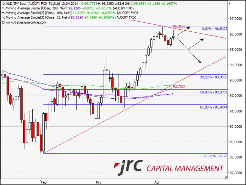 Fundamentaler AusblickDer AUD/JPY folgt weiter seinem Aufwärtstrend, der im Februar 2014 begonnen hatte. Aus dem neuen Jahreshöchststand in der letzten Woche bei 96,50 japanischen Yen pro australischem Dollar ergibt sich jedoch neues Korrekturpotenzial.Im Hinblick auf JPY und AUD betreffende Wirtschaftsdaten erwartet das Währungspaar eine ruhige KW 16. Zum Wochenauftakt veröffentlicht die Reserve Bank of Australia ihr jüngstes Sitzungsprotokoll, das neue Hinweise auf die Ausrichtung der Geldpolitik liefern könnte. Es folgt am Donnerstag die japanische Industrieproduktion. Angesichts der wenigen fundamentalen Termine könnte die Charttechnik eine größere Rolle spielen.Technische AnalyseEinerseits sieht das Chartbild des AUD/JPY auf täglicher Basis durchaus positiv aus, auf der anderen Seite besteht gleichzeitig viel Raum für Kurskorrekturen.Hier geht es zum ChartAuf das neue Jahreshoch vom 04.04.2014 folgte eine kurzfristige Korrektur um etwa 150 Pips. Von dort aus könnte der Kurs wieder Anlauf nehmen in Richtung eines neuen Jahreshochs. Dazu müssten zunächst die Widerstände bei 96,36 und 96,50 durchbrochen werden.
