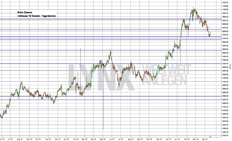 Die Analysten vergaben in den ersten vier Monaten des Jahres größtenteils das Votum „halten“. Die Kursziele der Analysten von Credit Suisse, S&P Capital IQ, Société Générale, Bernstein Research, Morgan Stanley, Berenberg, Merrill Lynch, Barclays, Exane BNP Parisbas, Independent Research, Deutsche Bank, Jefferies, Goldman Sachs und UBS liegen zwischen 4.600 Pence und 3.126 Pence. Im Durchschnitt ergibt sich ein Kursziel von 3.776 Pence. Die Aktie von AstraZeneca wird an der Heimatbörse, der London Stock Exchange (LSE), mit der höchsten Liquidität gehandelt. Aus diesem Grund werden die Kursziele in britischen Pence angegeben. 3.776 Pence sind folglich 37,76 britische Pfund (GBP). Der EUR/GBP wird derzeit an den Devisenmärkten im Durchschnitt mit 0,8250 gehandelt. Damit entspricht ein Kurs von 3.776 Pence rund 45,80 Euro. An der LSE schloss die Aktie am Gründonnerstag mit einem Kurs von 3.781,50 Pence. Die Kursprognosen lassen hier also nicht mehr viel Phantasie zu. An der LSE wurde am Ostermontag nicht gehandelt. Kursbewegungen konnte man jedoch in den an der NYSE gehandelten ADS-Papieren feststellen. Die Aktie stieg zwischenzeitlich um rund 9 Prozent und erreichte ein Tageshoch von 68,76 US-Dollar. Es gibt also doch Kurspotenzial! Der sensationelle Grund war die Meldung der aktuellen Sunday Times, in der von einer Übernahmeofferte seitens des US-Pharmakonzerns Pfizer berichtet wurde. Dem Artikel zufolge wollte Pfizer 100 Mrd. US-Dollar für AstraZeneca bieten (derzeit liegt die Marktkapitalisierung bei rund 80 Mrd. US-Dollar). Bei den aktuellen Wechselkursverhältnissen wären dies rund 60 Mrd. britische Pfund (GBP) oder rund 73 Mrd. Euro. AstraZeneca habe das Übernahmeangebot jedoch zurückgewiesen. Möglicherweise könnte dem ersten Angebot aber bald ein weiteres folgen. Pfizer wird sich bestimmt nicht so schnell geschlagen geben. Warum beabsichtigen die US-Amerikaner gerade jetzt eine Übernahme von AstraZeneca? Die Briten haben gemäß ihrer Bilanz für 2013 (Bilanzierung nach IFRS) einen Gesamtumsatz in Höhe von 25,7 Mrd. US-Dollar erzielt. Das Ergebnis der gewerblichen Geschäftstätigkeit lag bei 3,3 Mrd. US-Dollar und der Jahresüberschuss bei 2,6 Mrd. US-Dollar. Die Dividende betrug 2,0275 US-Dollar je Aktie. Per 31.12.2013 hatte AstraZeneca 51.600 Mitarbeiter. AstraZeneca verfügte zum Bilanzstichtag über 10,0 Mrd. US-Dollar an liquiden Mitteln, ein gezeichnetes Kapital von 314,3 Mio. US-Dollar und hatte Verbindlichkeiten gegenüber Kreditinstituten in Höhe von 222 Mio. US-Dollar. Die Bilanzsumme lag bei 55,9 Mrd. US-Dollar und bleibt damit seit 2009 nahezu stabil. Anders ist dies jedoch bei den Gesamtumsätzen. Diese sind seit Jahren deutlich rückläufig. Zwischen 2009 und 2011 verzeichnete man noch Umsätze in Höhe von 32,8 bis 33,6 Mrd. US-Dollar. 2011 hatte AstraZeneca noch einen Jahresüberschuss von 10,0 Mrd. US-Dollar erwirtschaftet. Für 2013 hat man nur noch rund ein Viertel dieser Summe vorzuweisen. Die reinen Zahlen sind also nicht gerade ein offensichtlicher Übernahmegrund. AstraZeneca verfügt über eine hohe Barreserve, doch bis 2020 laufen einige wichtige Patente von Haupteinnahmequellen des Konzerns aus. Es ist bis dato noch nicht sicher, ob der Konzern die daraus resultierenden Mindereinnahmen mit seinen in der Pipeline befindlichen und noch weiter zu entwickelnden Medikamenten wird auffangen können. Erst am 07.04. hatte AstraZeneca-Chef Pascal Soriot angekündigt, bis zum Jahr 2020 zehn neue Medikamente auf den Markt bringen zu wollen. Neben dem Wachstum durch Forschung und Entwicklung wächst der Konzern auch anorganisch. AstraZeneca kaufte erst jüngst den US-Pharmakonzern Bristol-Myers Squibb aus einer Diabetes-Allianz heraus und führt das Projekt nun in Eigenregie. Auch im Bereich der Krebsmedikamente will man möglicherweise zukaufen. Allein 2013 tätigte AstraZeneca mit AlphaCore, Amplimmune, Omthera, Pearl Therapeutics und Spirogen fünf weitere Zukäufe. Bis 2017 rechnet der Vorstand noch mit rückläufigen Umsatzzahlen. Dann soll laut Vorstand zumindest das Niveau von 2013 wieder erreicht werden. Für 2014 rechnet man mit einem Umsatz von 15,21 Mrd. GBP, 2015 sollen es 15,09 Mrd. GBP werden. Das EBIT läge demnach 2014 bei 4,45 Mrd. GBP und 2015 bei 4,36 Mrd. GBP. Der Gewinn je Aktie rutscht von 258,081 Pence 2014 auf 254,76 Pence 2015. Die Nettoverschuldung steigt 2014 kurzfristig auf 1,61 Mrd. GBP (2013 lag sie noch bei 699,77 Mrd. GBP), 2015 soll sie sich aber wieder auf 1,03 Mrd. GBP reduzieren. Sollte auch nur ein möglicher Blockbuster der nahen Zukunft durch eine der wichtigsten Aufnahmeprüfungen der Pharmabranche (das Genehmigungsverfahren der FDA) fallen, so wären die weiteren Mindereinnahmen ein schwerer Schlag für den britisch-schwedischen Konzern und demnach auch für den möglichen Bieter Pfizer. Die Börsen werden die vermeintliche Übernahme-Story vermutlich zunächst einmal feiern. Die theoretische Fallhöhe des Aktienkurses vergrößert sich derzeit bereits, denn solche Kurssprünge können auch von kurzer Dauer sein. Erst im Februar hatte AstraZeneca seine Anleger auf eine mehrjährige Durststrecke eingestimmt. Das Unternehmen legt am 24.04. seine neuesten Zahlen vor.