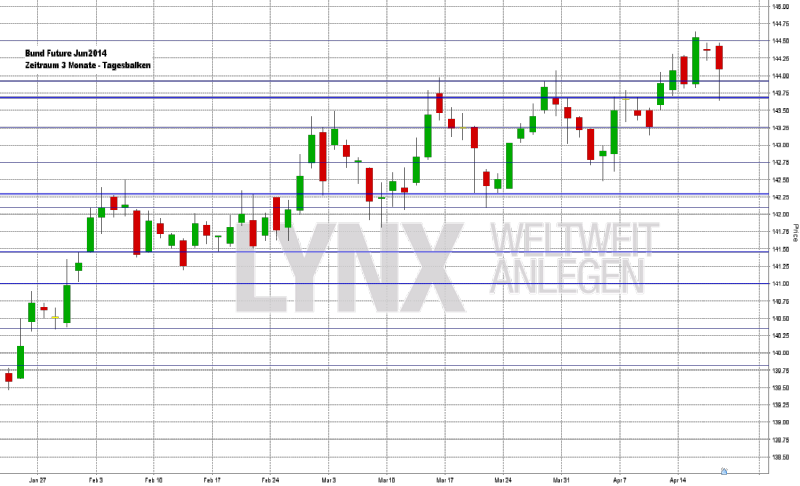 Ein Long-Einstieg führte im Montagshandel zunächst zu einem kleinen Verlust, aber am Dienstag konnte der Bund-Future wiederum ein neues Hoch erzielen. Mittwoch und Donnerstag gab der Bund-Future dann erneut ab und testete die Unterstützung 143,70, welche als richtungsentscheidend gelten muss. Der Schlusskurs vom Donnerstagabend lag dann wieder etwas höher bei gut 144,00 Zählern. Weiterhin bleibt der Bund oberhalb der Marke von 143,70 für Long-Trades interessant, und Kurse in Richtung des alten Hochs beziehungsweise knapp darüber wären ein realistisches Ziel. Kurse unter dieser Unterstützung sollten vorerst für eine Trading-Pause genutzt werden, da aus Sicht des aktuellen Charts Kurse unter 143,25 als nicht sehr wahrscheinlich einzustufen sind.
