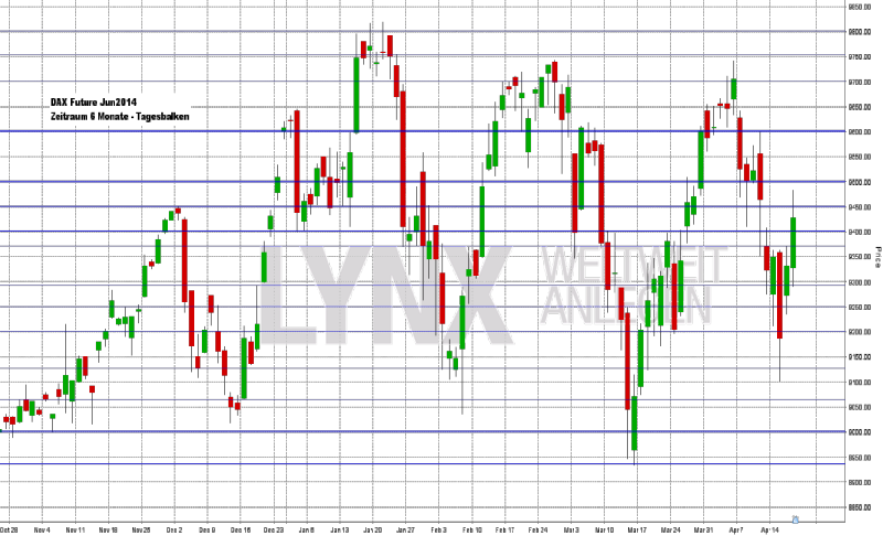In den letzten Handelstagen vor Ostern hat der DAX-Future zunächst die Kursmarken nach unten getestet und erreichte sein Wochentief an der Marke von 9.100 Punkten. Nach diesem Tief standen die Zeichen bis zum Handelsschluss am Donnerstagabend wieder auf Erholung. Das Wochenhoch lag knapp unter 9.500 und der Schlusskurs bei 9.429 Punkten. Der Markt ist nun nach wie vor mit Vorsicht zu genießen. Die in der vergangenen Woche angesprochene Seitwärtszone seit Ende letzten Jahres ist weiterhin intakt. Teilweise willkürliche Ausschläge in Short- wie auch Long-Richtung wären nach diesem Szenario nicht ungewöhnlich. Eine langfristige Trendfolge wäre somit vorerst ausgeschlossen. Etwas kurzfristiger gesehen, könnte die eine oder andere Short-Überlegung unter der 9.500-Punkte-Marke weiterhin Früchte tragen. Ein realistisches Ziel wäre hier die Marke von 9.200 Punkten. Kurse oberhalb von 9.600 Punkten wären theoretisch erneut long zu werten, wobei Trades in diese Richtung aus aktueller Sicht noch nicht zwingend umgesetzt werden sollten.