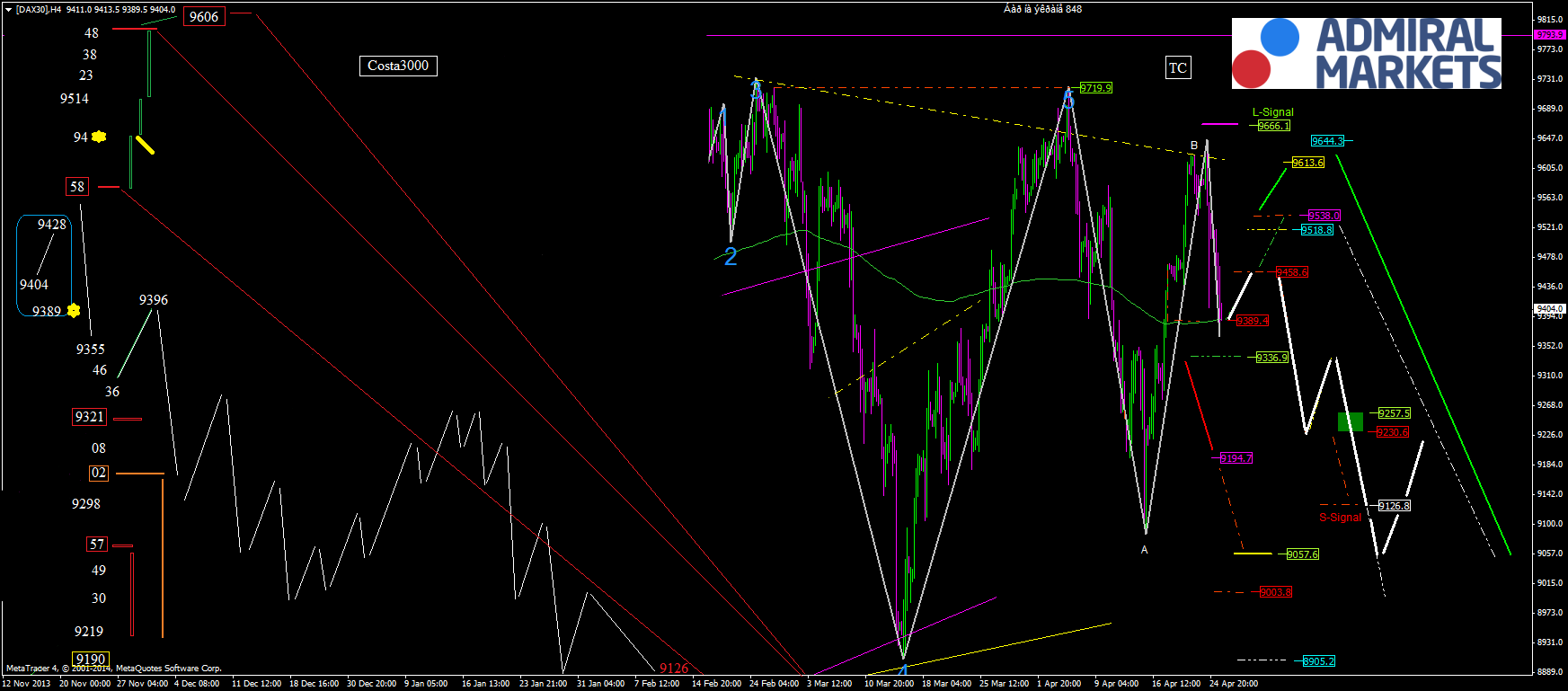 DAX: Trend positiv, aber politische News sind unberechenbarDie vergangene Handelswoche glich einer Achterbahnfahrt: Der Feiertagshandel am Ostermontag verlief seitwärts mit einer geringen Handelsspanne. Am Dienstag wich die Seitwärtsbewegung mit Beginn des vorbörslichen Handels einem dynamischen Aufwärts-Move. Der deutsche Leitindex lief bis in den Bereich der 9.600er-Marke, um nach einer Korrektur sein Wochenhoch bei 9.646 Punkten zu erreichen. Von hier aus setzte sich der DAX dynamisch nach unten ab, konnte sich aber oberhalb der 9.400er-Marke stabilisieren, um danach in eine 75-prozentige Korrektur überzugehen. Nach einer kurzen Stagnation am Freitag setzte erneut eine Abwärtsbewegung ein, die durch die guten Konjunkturerwartungen der University of Michigan nicht aufgehalten werden konnte. Der DAX erreichte sein Wochentief bei 9.366 Punkten und ging knapp oberhalb von 9.400 Punkten aus dem Wochenhandel. Auf Wochensicht führte dieses Auf und Ab zu einem Mini-Minus von 0,09 Prozent.Wie könnte es weitergehen?DAX-WS: 9.459…9.518DAX-US: 9.389…9.387…9.337… 9.258…9.230…9.194…9.126…9.086…9.058…9.004Weitere Widerstände/Unterstützungen können dem Chart entnommen werden.Hier geht es zum Chart Weiterhin behalten die zum Teil abgearbeiteten Chart-Formationen Gültigkeit. Erst bei einer Negierung auf der Unterseite wären weitere Tiefs nicht auszuschließen.Der DAX könnte nach einer Stabilisierung oberhalb des Xetra-Schlusskurses (9.402) bis in den Bereich um 9.459 Punkte steigen, um hier sein Wochenhoch zu erreichen.In der letzten Woche haben ausschließlich politische Nachrichten (die Ukraine und Putin) zu dem Verlust geführt. Der Trend für die nächsten Tage und Wochen ist eigentlich positiv, aber politische Nachrichten sind nicht vorhersehbar.Bei Unterschreiten von 9.337 Punkten sind die Zielmarken bei 9.258 bis 9.231 Punkten zu finden. Darunter könnte der DAX die Marken von 9.195, 9.127 und 9.058 dynamisch anlaufen.Box-Bereich 9.459 bis 9.337Tagesschlusskurs-Marken: 9.459 und 9.230Intraday-Marken: 9.459 und 9.337Range: 9.459 bis 9.058Unser Setup für die neue DAX-Handelswoche:Short-Einstiege: 9.459…9.389/37….9.258/31…9.194/27Long-Einstiege: 9.389/37…9.258/31…9.194/27…9.058