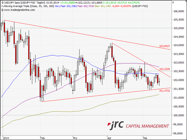 Fundamentaler AusblickDie überraschend guten BIP-Zahlen aus Japan hatten nur geringe Auswirkungen auf den USD/JPY-Kurs. Damit werden weitere QE-Maßnahmen seitens der Bank of Japan unwahrscheinlicher.Die KW 21 wird eher ruhig, was Konjunkturdaten aus Nordamerika und Japan betrifft. Hervorzuheben ist die Veröffentlichung des Fed-Sitzungsprotokolls vom April, welches tiefere Einblicke in die Geldpolitik liefert. Außerdem folgen im weiteren Wochenverlauf neue Daten vom US-Immobilienmarkt mit den Verkäufen vorhandener und neuer Immobilien.Technische AnalyseSeit Beginn des Jahres fehlt dem USD/JPY eine klare Richtung. Der Seitwärtskorridor verengt sich weiterhin.Hier geht es zum ChartAbwärtsbewegungen werden zunächst mit der Unterstützung des Februar-Aufwärtstrends bei 101,47 japanischen Yen pro US-Dollar konfrontiert. Bei 101,17 folgt die nächste Unterstützung in Form der 200-Tage-Linie. Danach könnte der Kurs einen neuen Jahrestiefststand bei 100,75 erreichen.Im Falle einer Dollar-Stärke gegenüber dem Yen bietet die 55-Tage-Linie bei 102,33 den ersten Widerstand. Die kurzfristige Abwärtstrendlinie bei 102,52 könnte einen weiteren Anstieg verhindern. Danach folgt die 100-Tage-Linie bei 102,73. Im Anschluss ergäbe sich Potenzial bis 103,85.Von Jannis Raftopoulos