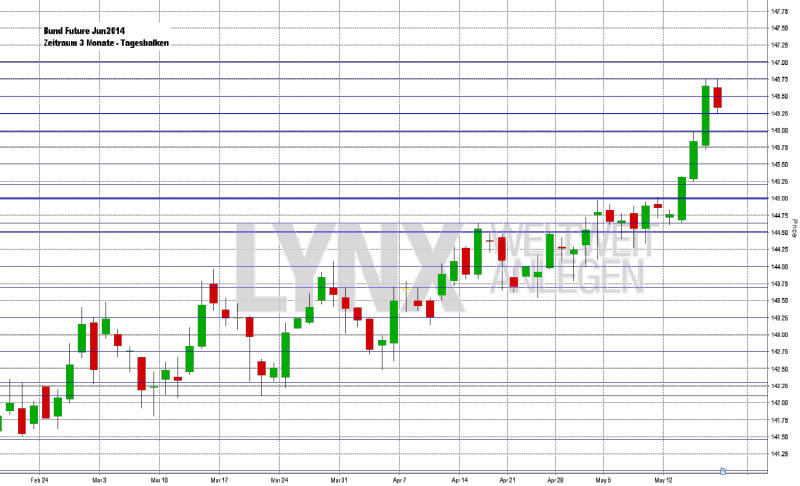 Das neue Rekordhoch ist jetzt da. Mit 9.810,29 Punkten kletterte der DAX zwischenzeitlich auf den höchsten Stand aller Zeiten. Doch danach ging es gleich wieder abwärts. Am Freitag schloss der DAX im Xetra-Handel mit 9.629,10 Punkten. Auf Wochensicht stehen 0,50 Prozent Kursplus auf dem Tableau. Auf Monatssicht können rund 3,35 Prozent an Performance verbucht werden, jedoch seit Anfang des Jahres 2014 jedoch magere 0,8 Prozent. Damit ist die Bilanz zwar noch positiv, jedoch bewegt sich der DAX seit geraumer Zeit seitwärts. An der Wall Street schloss der Dow Jones mit einem Punktestand von 16.491,31. Der NASDAQ 100 beendete den Freitagshandel an der Technologiebörse NASDAQ bei 3.587,199 Punkten. Der breiter gefasste S&P 500 notierte zum Handelsschluss bei 1.877,86 Punkten. Die europäische Gemeinschaftswährung Euro tendierte seitwärts und beendete den Handel an den Forex-Märkten mit 1,3695 US-Dollar. Rohöl der Nordseesorte Brent kostete zum Handelsende 109,81 US-Dollar je Fass. Der Preis für eine Feinunze Gold stagnierte ebenso und lag zum Freitagsschluss bei 1.292,90 US-Dollar. An der EUREX ging der Euro-Bund-Future nach einer turbulenten Handelswoche mit 146,27 Zählern ins Wochenende. Demnach rentieren zehnjährige Bundesanleihen gerade einmal mit 1,33 Prozent. Die Renditetiefs zu Hochzeiten der Schuldenkrise (sie lagen um die Marke von 1,12 Prozent) sind damit nicht mehr sehr weit entfernt. Für den 21.05.2014 steht eine Auktion der Finanzagentur des Bundes an. Im Umfang von von 5 Mrd. Euro sollen neue Zehn-Jahres-Läufer ausgegeben werden (15.05.2024).