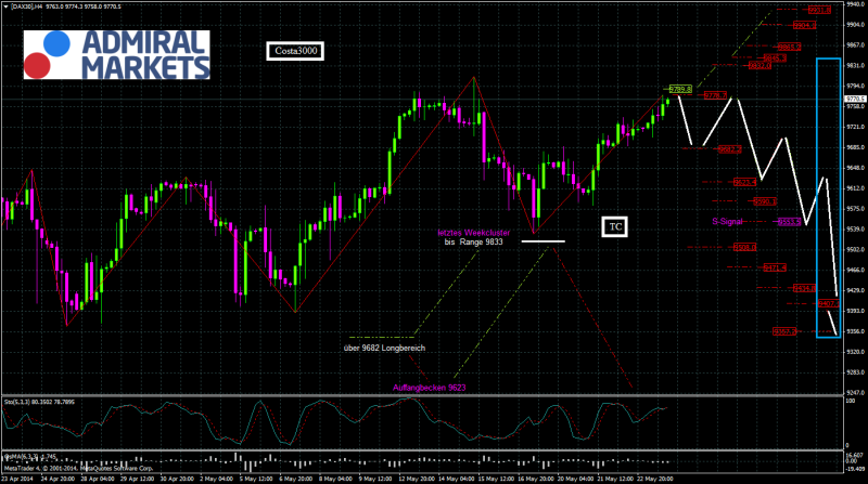 Fatal wäre ein Fehlausbruch zu werten. Dieser würde dazu führen, dass sich die Seitwärtsbewegung zunächst fortsetzen würde. Obwohl es derzeit so aussieht, als ob der DAX die Kursziele auf der Oberseite abarbeiten könnte, sollte die Unterseite nicht vernachlässigt werden. Gelingt es dem Index nicht, die 9.815 zügig und überzeugend zu überwinden, so wären zunächst wieder Rücksetzer bis in den Bereich der 9.623/590 Punkte möglich. Prägen sich die Rücksetzer bis 9.550 Punkte aus, so würde ein neues Short-Signal aktiviert werden. Dies könnte weitere Abgaben bis 9.440 Punkte nach sich ziehen.