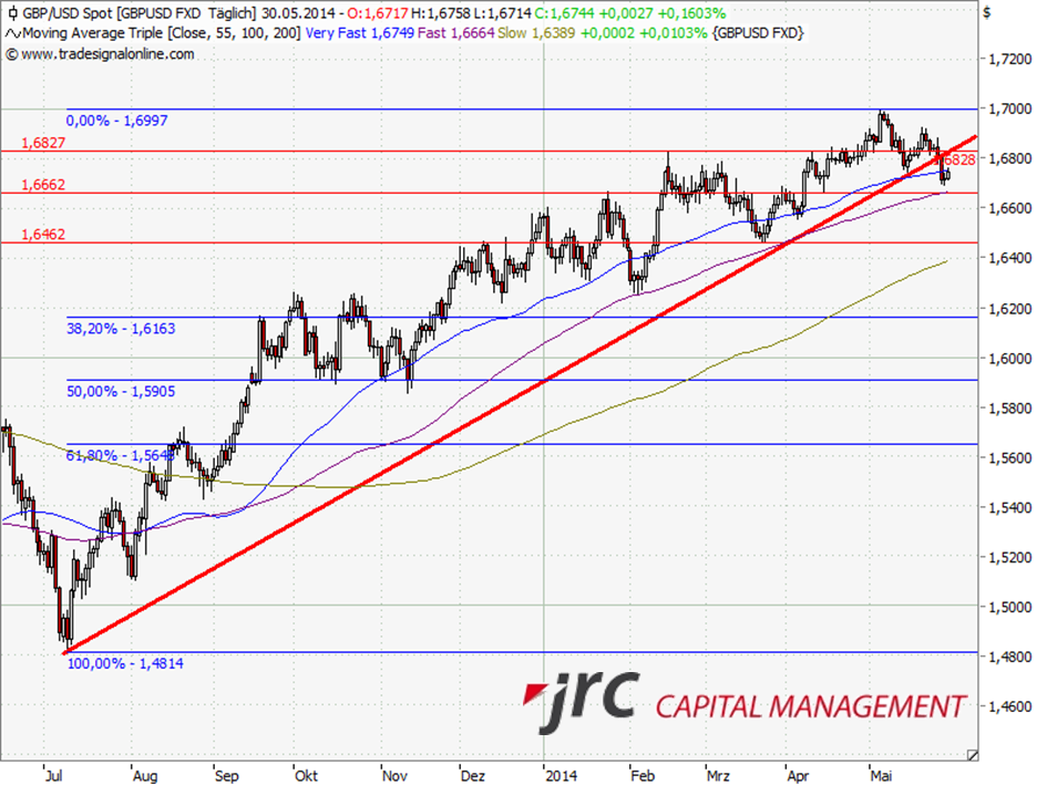 Ausblick im AllgemeinenDer Wirtschaftskalender ist voller Termine, dazu kommt ein möglicher Trendausbruch – die erste Juniwoche könnte für den GBP/USD entscheidend werden.Kalenderwoche 23 beginnt mit dem britischen PMI Manufacturing Index sowie dem ISM-Herstellungsindex. Am Mittwoch erscheint die US-Arbeitsmarktstatistik des privaten Anbieters ADP, die einen ersten Vorgeschmack auf die Nonfarm-Payrolls-Zahlen am Freitag geben wird. Danach folgen die US-Handelsbilanz sowie das Beige Book der Fed. Ein besonders wichtiger Tag ist Donnerstag, der 5. Juni: Dann fällen sowohl die EZB als auch die Bank of England ihre Leitzinsentscheidungen. Allgemein wird von der EZB eine weitere Zinssenkung, für Großbritannien dagegen keine Änderung erwartet. Schließlich endet die Woche mit den Nonfarm-Payrolls-Beschäftigungszahlen. Nach 273.000 neuen Stellen außerhalb der Landwirtschaft im Vormonat liegt die Prognose für Mai nun bei 205.000 neuen Arbeitsplätzen.JRCTechnische AnalyseDer GBP/USD durchbrach in der letzten Woche den Aufwärtstrend, der im Juli 2013 begonnen hatte. Aktuell testet er die 55-Tage-Linie bei 1,6749 US-Dollar pro britischem Pfund.Hier geht es zum ChartFällt der GBP/USD unter die Marke von 1,67, befände sich die nächste Unterstützung bei 1,6662, wo der 100-Tage-Durchschnitt auf das High von Januar 2014 trifft. Dieses Level wurde im Laufe des Jahres bereits mehrfach als Widerstand beziehungsweise als Unterstützung getestet. Danach ergäbe sich weiterer Freiraum bis 1,6500 GBP/USD.Durchbricht der GBP/USD die 55-Tage-Linie, stellt das Level bei 1,6827 den nächsten Widerstand dar. Dort kreuzen sich der Aufwärtstrend des Sommers 2013 und das High vom Februar 2014. Dieser Widerstand erwies sich schon im April als Hindernis für den Kursanstieg. Im Anschluss steht die Marke von 1,6900 auf dem Weg zum Jahreshoch bei 1,7000 GBP/USD.