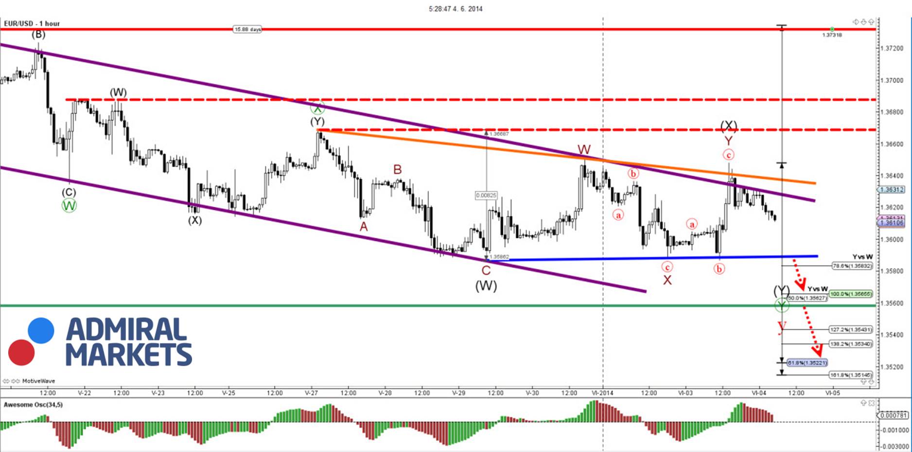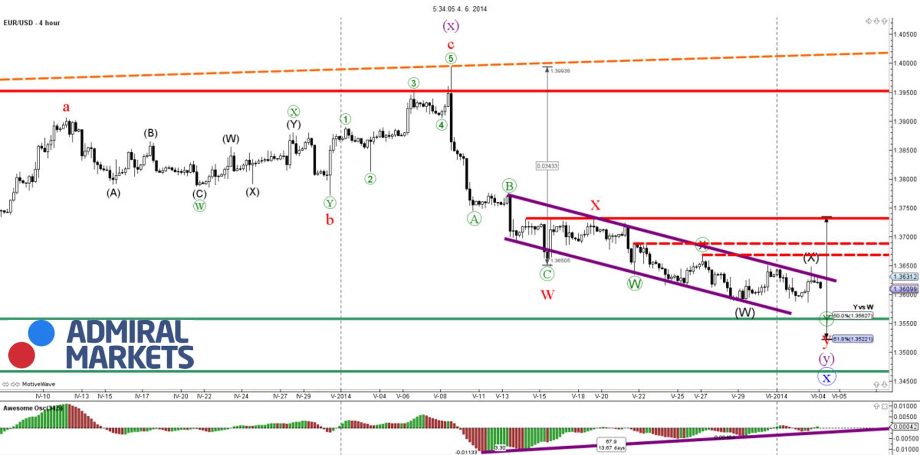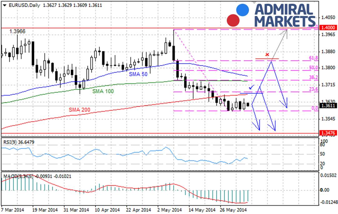 Eines der wichtigsten Ereignisse dieser Woche ist unbestritten die Entscheidung über die Geld- und Zinspolitik der EZB, deren Sitzung morgen stattfindet. Die Marktteilnehmer schauen in letzter Zeit verstärkt nach Frankfurt, sie hoffen darauf, dass sich Maßnahmen zum Schutz vor einer drohenden Deflation abzeichnen. Die am letzten Freitag veröffentlichten Daten zeigen, dass die Inflationsrate in der dritt- und der viertgrößten Wirtschaftsnation der EU, Italien und Spanien, gesunken ist. Die Notwendigkeit von Gegenmaßnahmen wird immer deutlicher. Deshalb wird erwartet, dass die EZB den historisch niedrigen Leitzins von 0,25 Prozent noch weiter reduziert und möglicherweise einen negativen Zins auf Depositen beschließt.Man muss davon ausgehen, dass die Märkte die möglichen Beschlüsse der EZB bereits in die Kurse mit eingepreist haben. Sollten die Herren dann doch von spürbaren Maßnahmen absehen, sind umfassendere Korrekturen des Euros zu erwarten. Es bleibt wie immer spannend.Widmen wir uns in diesem Sinne der heutigen Technischen Analyse:Hier geht es zum ChartAlle Versuche des EUR/USD, sich nach oben durchzukämpfen, blieben bis jetzt wenig erfolgreich, das steigert die Wahrscheinlichkeit deutlich, dass der Abwärtstrend wieder aufgenommen wird. Sein Ziel wäre immer noch in der Unterstützung bei 1,3475 zu sehen, das würde durch eine Festigung unterhalb von 1,3600 bestätigt.Als nächste Unterstützung fungiert der 200-Tage-SMA. Sollte diese Linie nicht halten, bestätigt das eine Korrektur des Paares. Ziele wären in diesem Fall im Bereich bei 1,3740, wo der 100-Tage SMA verläuft, aber auch 38,2 Prozent Fibo der Absenkung 1,3993-1,3588. Eine Trendwende nach unten wäre hier sehr wahrscheinlich.Sollte jedoch ein Durchbruch oberhalb von 1,3740 stattfinden, wäre ein Test des 50-Tage-SMA oder der Bereiche 1,3800 und 1,3840 (50,0 Prozent und 61,8 Prozent Fibo Retracement derselben Absenkungen wie oben) möglich. Die Trendwende nach unten kann von allen diesen Levels aus stattfinden.In all diesen Fällen sehen wir als nächstes Ziel des Abwärtstrends die Unterstützung 1,3475. Gibt diese nach, folgen die Bereiche 1,3300 und 1,3100. Gleichzeitig kann nur eine Festigung oberhalb von 1,3840 eine neue Aufstiegstendenz in Richtung des Widerstandes 1,4000 andeuten.Nun kommen wir zu unserer Daily-Wave-Analyse:Aufgrund der Divergenz zwischen dem Kurs und dem Oszillator (purpurne Linie auf dem Awesome Oscillator) erlebte das Paar gestern eine Korrektur nach oben, konnte jedoch aus dem Abwärtskanal ausbrechen. Der Kurs bleibt momentan stabil auf dem 4-Stunden-Chart.EUR/USD – 4H ChartHier geht es zum ChartEs gibt verschiedene Ausbruchsszenarien (rote Pfeile), je nachdem, welche Unterstützung nachgibt (blau und grün).EUR/USD – 1H ChartHier geht es zum ChartHinweise in eigener Sache:Lesen Sie auch unsere neue Dow-Jones-Analyse, wöchentlich von Daytrader Jochen Schmidt auf unserer Webseite: http://www.admiralmarkets.de/Dow-Jones-Analyse.Persönliche Konditionen für DAX, Dow und EUR/USD ab 20.000 Euro Kontogröße individuell auf Sie zugeschnitten! Mehr auf http://www.admiralmarkets.de/Daytrading-Forex-DAX.Im Namen von Admiral Markets wünsche ich Ihnen erfolgreiche Trades!Ihr Jens ChrzanowskiGeschäftsführer Admiral Markets Partner Deutschland, MT am Germany GmbHDISCLAIMER: http://www.admiralmarkets.de/risikohinweis