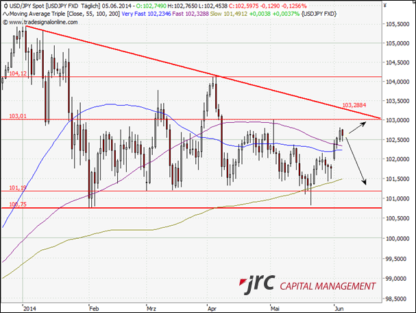 Seit Beginn des Jahres 2014 verläuft der USDJPY in einer Keilformation. Nach einem Test der 200-Tages-Linie im Mai stieg der Kurs bis auf 102,79 Japanische Yen pro Dollar, es bleibt jedoch fraglich ob er dieses Level halten kann.
