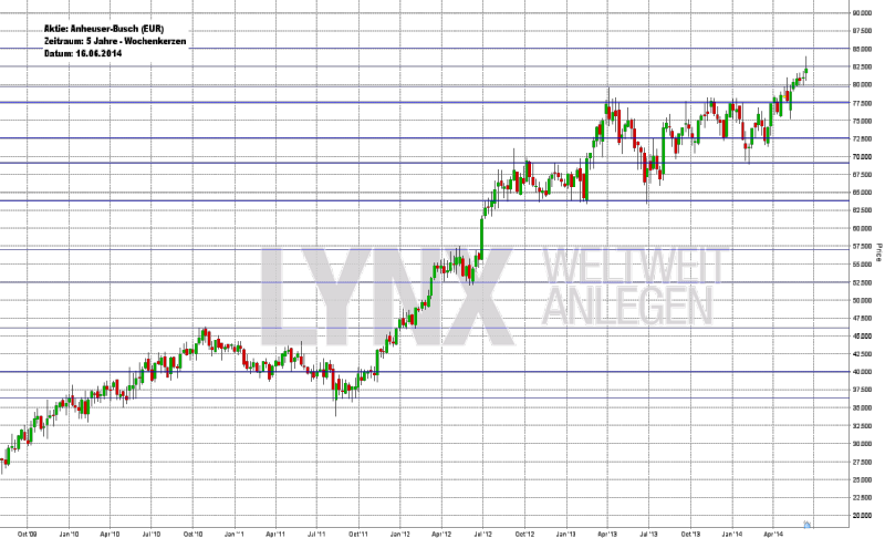 In den vergangenen fünf Jahren hat sich die Aktie von Anheuser-Busch sehr gut entwickelt. Von 27,50 Euro konnte sie sich bis etwa 84,00 Euro heraufarbeiten. Nennenswerte charttechnische Rückschläge musste der Wert auf diesem Weg kaum hinnehmen. Lediglich im zweiten Quartal des letzten Jahres ging es zwischenzeitlich von knapp 80,00 Euro bis auf knapp 63,00 Euro hinunter, was einem Rückgang um rund 21 Prozent gleichkommt. Seit diesem Tief konnte sich die Aktie aber wieder erholen und erkämpfte sich in den letzten Wochen immer mal wieder neue Hochs. Der letzte Schlusskurs vom vergangenen Freitag lag auf hohem Niveau bei rund 82,00 Euro. Die Unterstützung 77,50 Euro gilt jetzt charttechnisch als entscheidende Marke im Hinblick auf eine Fortsetzung des aktuellen Long-Trends. Kurse darüber könnten nach wie vor für Käufe in Betracht kommen. Auch ein Bruch dieser Marke wäre noch kein zwingendes Hindernis für Käufe, es sollte jedoch mit etwas bedachterem Ansatz an trendfolgende Ideen herangegangen werden. Short-Trades sind aus aktueller Sicht noch keine Option und wären erst unter der Marke von 70,00 Euro eine neue Analyse wert. Für einen Long-Einstieg wäre ein leichter Rücksetzer an die Marke von 80,00 Euro oder gar an die 77,50 Euro ideal und vom Chance- Risiko-Verhältnis vertretbar. Weitere neue Hochs sind aus aktueller Sicht nicht auszuschließen.