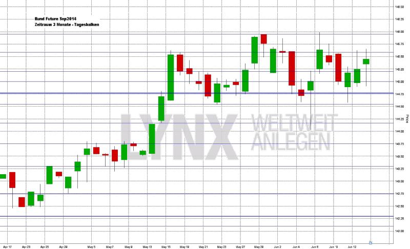 Seit Mittwoch konnte im Bund-Future mit der Long-Seite etwas Geld verdient werden, wobei die eine oder andere leichte Short-Sequenz das Handeln etwas erschwerte. Als wichtig erschienen die Unterstützung bei 144,75 und der Widerstand um die Marke von 145,60. Der Freitagsschlusskurs lag etwa an der Marke 145,45. Die Achtungszeichen für eine eventuelle Seitwärtsphase zwischen 144,75 und 146,00 bleiben weiterhin stehen. Gerade auch angesichts immer wieder auftretender Short-Sequenzen scheint sich der Markt schwerzutun, mit gesunder Stärke zu steigen. Das Wochenhoch könnte somit etwas defensiver nicht höher als 146,00 angenommen werden, und ein eventuelles Hin und Her sollte bei Trades eine Gewinnmitnahme nach sich ziehen.
