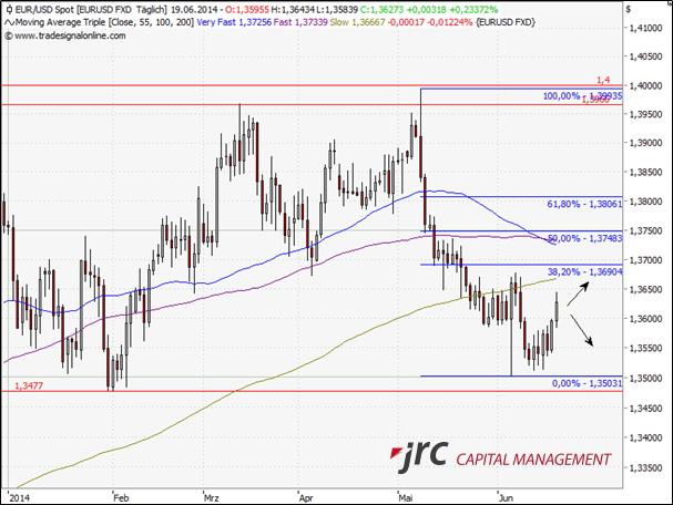 Die geldpolitische Sitzung der US-Notenbank Federal Reserve in KW 25 zerstreute aufkommende Spekulationen über eine baldige Zinserhöhung. Wie erwartet senkt die Fed ihr konjunkturstützendes Anleiheankaufprogramm von 45 auf 35 Milliarden Dollar pro Monat. Derweil bleibt der Leitzins auf dem historisch niedrigen Niveau von 0 bis 0,25 Prozent. Dementsprechend stark präsentierte sich der Euro gegenüber dem US-Dollar und legte zu auf 1,3625 EUR/USD.