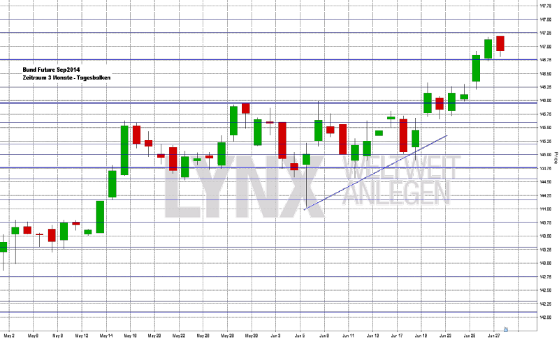 Der vorsichtige Weg auf der Long-Seite konnte in den vergangenen Handelstagen sehr gut beschritten werden. Bis auf den letzten Handelstag der Woche lagen alle Tagesschlusskurse im Plus. Der Freitagsschlusskurs betrug etwa 146,90, was ein Wochenplus des Bund-Futures von rund 110 Ticks bedeutet. Die Grundrichtung bleibt somit weiterhin long, und Kurse oberhalb von 146,00/146,25 könnten weiterhin für Trades in diese Richtung genutzt werden. Eine antizyklische Spekulation auf die Short-Seite sollte, wenn überhaupt, mit sehr großer Vorsicht gehandelt werden.