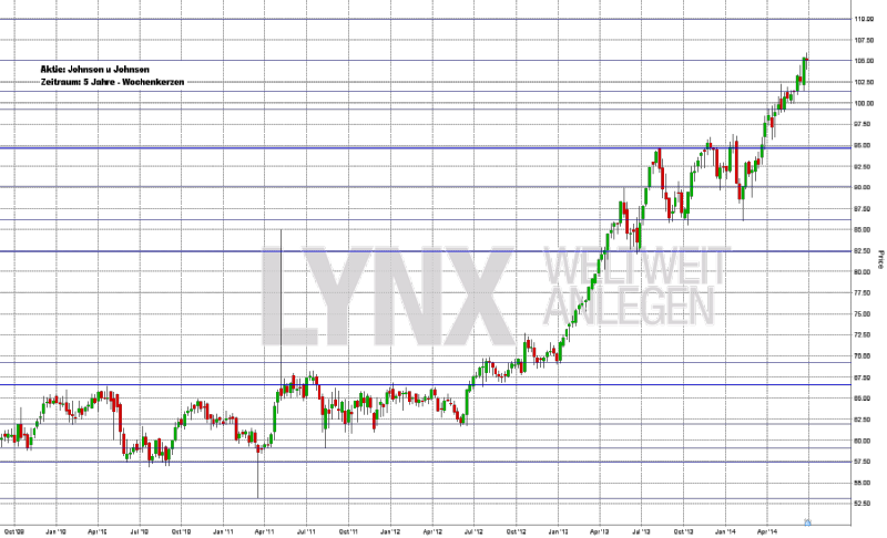 Johnson & Johnson (Symbol: JNJ) gilt als eines der global führenden Unternehmen im Bereich der Gesundheitsfürsorge. Eigenen Angaben zufolge ist der Konzern die sechstgrößte Firma im Bereich der Gesundheitsvorsorge und deren Verbrauchsgüter. Zum Konzern gehören über 275 Unternehmen in mehr als 60 Ländern. Insgesamt arbeiten 128.700 Menschen weltweit für den Konzern aus New Brunswick (Bundesstaat New Jersey, USA). Man residiert (wie könnte es bei einem Konzern dieser Größe anders sein) am Johnson & Johnson Plaza 1. Die wichtigsten Geschäftsbereiche sind „Consumer“, „Medical Devices & Diagnostics“ und „Pharmaceuticals“. Der Konzern fertigt demnach nicht nur Hautpflegeprodukte, sondern auch medizintechnische Geräte und Medikamente (das Anwendungsspektrum ist sehr breit und umfasst beispielsweise Krebs, Herz-Kreislauferkrankungen, Schmerzerkrankungen, neurologische Erkrankungen und Infektionen). Bestimmt entdeckt man bei einem Gang durch den Supermarkt oder die Drogerie ganz schnell mehrere Produkte, die dem Hause Johnson & Johnson zuzuordnen sind. Im Bereich der Hautpflege sind dies zum Beispiel starke Marken wie Bebe, Neutrogena, Piz Buin, Frauen werden Carefree und o.b. kennen, Penaten gehört ebenfalls zum Konzern, aber auch Nicorette (Nikotinersatztherapie) und Listerine (Mundpflege). Zur FIFA-Fußballweltmeisterschaft in Brasilien widmet sich der Konzern einmal mehr der Gesundheit. Johnson & Johnson hat als offizieller Sponsor eine Reihe von Gesundheitsprogrammen und medizinischen Initiativen gestartet. Dies soll dem Wohlergehen der brasilianischen Nation dienen. Landesweit initiiert Johnson & Johnson derzeit die größte Blutspendenaktion in der Geschichte Brasiliens. An allen WM-Austragungsorten gibt es mobile Blutspendestationen. Alle „Volunteers“ (mehr als 14.000 Helfer) erhalten ein kostenfreies Gesundheitsscreening. Da es besonders viele junge Menschen sind, die am FIFA-Volunteer-Programm teilnehmen, wirkt diese Veranstaltung besonders nachhaltig und hat sehr präventiven Charakter, wie auch Herr Dr. Joseph Ferro (Corporate Medical Director von Johnson & Johnson) in einem Interview mit dem US-Sender FOX-News hervorhebt. Neben diesen Aktionen laufen in den anderen Konzernbereichen von Johnson & Johnson noch weitere, zum Beispiel die der deutschen Johnson & Johnson GmbH, die mit dem Programm „True Winners Care“ SOS-Kinderdörfer in Brasilien unterstützt. Botschafter dieser Aktion ist der brasilianische Fußballstar Dante. Johnson & Johnson hat im Geschäftsjahr 2013 gemäß der Gewinn- und Verlustrechnung (bilanziert wird bei Johnson & Johnson zum 03.01.) einen Gesamtumsatz von 71,3 Mrd. US-Dollar erzielt. Das Ergebnis der gewerblichen Geschäftstätigkeit lag bei 15,5 Mrd. US-Dollar. Der Jahresüberschuss für 2013 ist mit 13,8 Mrd. US-Dollar im Vergleich zu den letzten drei Jahren angewachsen. Je Aktie ergibt dies ein Netto-Ergebnis von 4,0589 US-Dollar. Die Dividende je Stammaktie betrug 1,9037 US-Dollar. 2013 führt Johnson & Johnson 128.100 Mitarbeiter in den Gehaltslisten. Die Bilanz weist für das Geschäftsjahr 2013 liquide Mittel in Höhe von 29,2 Mrd. US-Dollar, 74,1 Mrd. US-Dollar an wirtschaftlichem Eigenkapital, 3,1 Mrd. US-Dollar an gezeichnetem Kapital und Verbindlichkeiten in Höhe von 32,3 Mrd. US-Dollar aus. Die Bilanzsumme liegt 2013 bei 132,7 Mrd. US-Dollar und wächst seit Jahren an. Für 2013 liegt die Eigenkapitalquote bei 55,812 Prozent. Sie verharrt seit 2009 in etwa auf dem gleichen Niveau. Gemäß den Bilanzprognosen für 2014 und 2015 werden Gesamtumsätze von 74,88 Mrd. US-Dollar beziehungsweise 77,91 Mrd. US-Dollar avisiert. Für 2014 läge das EBIT damit bei 20,85 Mrd. US-Dollar, für 2015 sogar bei 22,20 Mrd. US-Dollar. Das ergäbe einen Gewinn je Aktie in Höhe von 5,87 US-Dollar im Jahr 2014 und 6,30 US-Dollar 2015. Die Dividende je Aktie könnte so für 2014 auf 2,75 US-Dollar angehoben werden, und für 2015 könnten sogar 2,9114 zu Buche stehen. Johnson & Johnson weist in der Projektion einen Nettogeldbestand von 20,24 Mrd. US-Dollar für 2014 aus. 2015 könnte der Nettogeldbestand schon bei 31,24 Mrd. US-Dollar liegen. Die Aktie von Johnson & Johnson ging am Freitag an der Wall Street (NYSE) mit 104,99 US-Dollar aus dem Handel. Damit hat der Konzern eine Marktkapitalisierung von 327,55 Mrd. US-Dollar. Die Aktie befindet sich zu rund 80 Prozent im Streubesitz. Rund 10 Prozent werden als eigene Anteile gehalten, BlackRock hält 5,00 Prozent und State Street Global Advisors ebenfalls 5,00 Prozent. Auf Sicht der letzten fünf Jahre erzielte die Aktie bereits eine Performance von rund 88 Prozent. Das Papier ist also nicht mehr sehr weit davon entfernt, sich im Wert zu verdoppeln. Das 52-Wochen-Tief lag bei 84,54 US-Dollar, das 52-Wochen-Hoch bei 105,97 US-Dollar. Die Aktie ist als defensiver Wert einzustufen (Johnson & Johnson ist mit den Bereichen Konsumgütern, Pharma und Medtech/Diagnostigs sehr breit aufgestellt). Das Papier ist seit März 1997 Mitglied im Dow-Jones-Index.