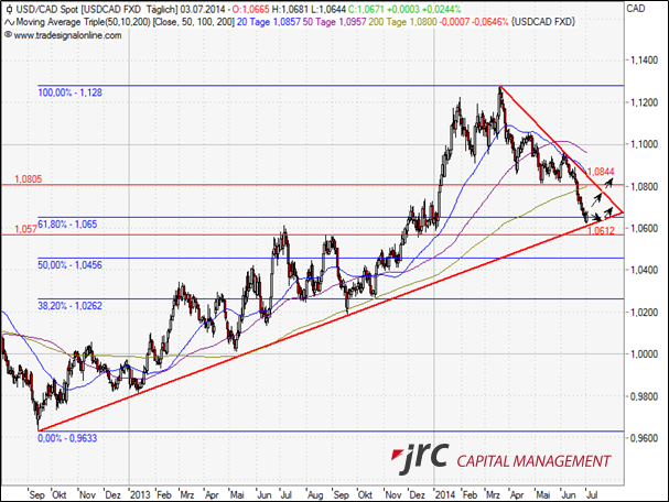 Nach einer sehr starken Aufwärtstrendphase im USD/CAD, die im Oktober 2012 begann und im März ihren Zenit bei 1,1280 fand, korrigierte der Kurs stark bis hin zum 61,8-Prozent-Fibonacci-Retracement, welches zusammen mit der Trendlinie und dem 1,0600-Level eine wichtige psychologische Unterstützung bildet.