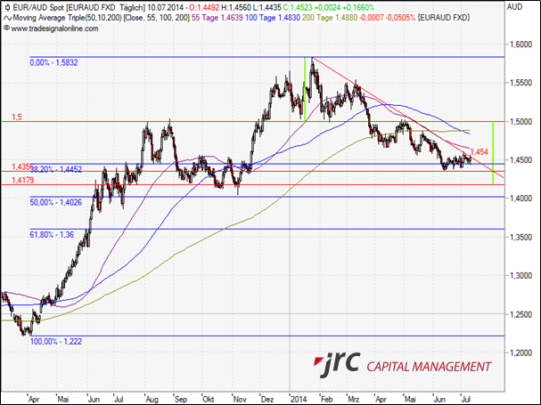 Beim höchsten Stand seit über drei Jahren von 1,5832 hat der EUR/AUD eine starke Abwärtsrallye begonnen und dank einer kurzfristigen Korrekturbewegung im März eine vorzeigbare Schulter-Kopf-Schulter-Formation komplettiert. Der Kurs befindet sich seit Anfang letzten Monats auf der Höhe des 38,2-Prozent-Fibonacci-Retracements (Apr. 13 / Jan. 14), welches sich in der Nähe der 1,45er-Marke bewegt. In Zusammenhang mit dem Fibonacci-Retracement stellt dieser Level eine wichtige Unterstützung dar, die es im Falle einer Fortführung der Abwärtsbewegung zu durchbrechen gilt.
