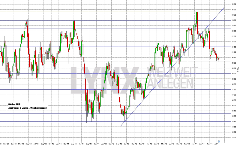 ABB (Börsenkürzel: ABBN) mit Sitz in Zürich/Schweiz ist ein globales Unternehmen der Energie- und Automatisierungstechnik. Das Unternehmen beschäftigt derzeit rund 150.000 Mitarbeiter und ist in über 100 Ländern aktiv. ABB ist im operativen Bereich in fünf Geschäftsbereiche eingeteilt, „power products“, „power systems“, „discrete automation and motion“, „low voltage products“ und „process automation“. Insgesamt steht den Kunden eine Reihe von Dienstleistungen zur Verfügung. Dabei nimmt auch das Thema Energieeinsparungen breiten Raum ein. Deutlich effizientere und klimafreundlichere Heizkraftwerke, mehr Effizienz auf der Straße und auf der Schiene – ABB ist ein großer Partner des Maschinenbausektors. Robotertechnik von ABB ist neben der Energietechnik, Energietechnik-Systemen, Industrieautomation und Antrieben, Niederspannungsprodukten und Prozessautomatisierung ein weiteres Produktfeld des Schweizer Konzerns. Wenn man Konzerne mit einem ähnlichen Spektrum wie dem von ABB sucht, so kommt man meist auf Alstom, General Electric und Siemens. Die Firmenhistorie von ABB reicht bis in die Gründungsjahre der Vorläufer-Gesellschaften 1883–1893 zurück. Die Analysen des Jahres 2014 zur Aktie der ABB geben ein eher gemischtes Bild ab. Von den 15 Analysen der bekannten Investment- und Research-Häuser JPMorgan, Merrill Lynch, Goldman Sachs, Credit Suisse, Morgan Stanley, Deutsche Bank, HSBC, Citigroup, UBS, S&P, Capital Research, Exane BNP Paribas, Barclays, Société Générale und Independent Research rieten neun Analysen zu einem „hold“ beziehungsweise gewichteten die Aktie der ABB neutral. Drei Analysen raten zum Kauf oder zum „übergewichten“ oder stufen die Aktie als „outperform“ ein, zwei Analysen raten zum Verkauf oder zum „untergewichten“. Das Kurszielband all dieser Analysen liegt zwischen 20,00 und 25,00 CHF. Das höchste Kursziel stammt von Credit Suisse mit 25,00 CHF – die Analyse stammt vom 16.06.2014 –, die niedrigsten Kursziele von Barclays (30.04.2014) und Goldman Sachs (08.07.2014) mit jeweils 20,00 CHF. Im Schnitt ergäbe sich ein Kursziel von 22,05 CHF. Die Aktie der ABB ging am Freitag mit einem Kurs von 20,41 CHF aus dem Handel an der SIX Swiss Exchange (Heimatbörse der ABB in der Schweiz am Handelsplatz Zürich). Damit erzielt der Konzern an der Börse eine Marktkapitalisierung in Höhe von 47,24 Mrd. CHF. Aktien der ABB sind zudem an den Handelsplätzen NYSE in New York und in Stockholm in Schweden gelistet. DIE ABB Ltd. (bilanziert wird gemäß US-GAAP) weist in ihrer Gewinn- und Verlustrechnung (GuV) für 2013 einen Umsatz in Höhe von 41,8 Mrd. CHF aus. Das Ergebnis der gewerblichen Geschäftstätigkeit lag 2013 bei 4,0 Mrd. CHF, das Zinsergebnis bei -321 Mio. CHF, was insgesamt zu einem Jahresüberschuss in Höhe von 2,8 Mrd. CHF führte. Je Aktie netto lag das Ergebnis für 2013 bei 1,0685 CHF. Insgesamt wurden 1,8 Mrd. CHF ausgeschüttet. Die Dividende für 2013 betrug 0,70 CHF je Stammaktie (eine konsequente Steigerung im Vergleich zu den Vorjahren). 2013 führte ABB 147.700 Mitarbeiter in den Gehaltslisten. Der Konzern verfügte zum Bilanzstichtag (31.12.2013) über 6,5 Mrd. CHF an liquiden Mitteln, 16,8 Mrd. CHF an wirtschaftlichem Eigenkapital, 2,4 Mrd. CHF an gezeichnetem Kapital und kommt so auf eine Bilanzsumme in Höhe von 48,1 Mrd. CHF. Die Eigenkapitalquote lag 2013 bei 39,96 Prozent. In den Bilanzprognosen für 2014 und 2015 werden für ABB Umsätze von 36,98 beziehungsweise 37,91 Mrd. CHF angeführt. Dies ergäbe für 2014 ein EBIT von 4,09 Mrd. CHF und für 2015 ein EBIT von 4,73 Mrd. CHF. Der Gewinn je Aktie könnte demnach von 1,195 CHF 2014 auf 1,401 CHF 2015 ansteigen. Die Dividende stiege dann von 0,7068 CHF 2014 auf 0,7442 CHF 2015. Die Nettoverschuldung des Konzerns baut sich weiter ab. 2014 sollen es nur noch 21,26 Mio. CHF sein, 2015 könnte ABB einen Nettogeldbestand in Höhe von 1,49 Mrd. CHF ausweisen. Die Aktie der ABB befindet sich zu rund 88,50 Prozent im Streubesitz. Die größten Einzelpositionen halten mit 8,10 Prozent die Investor AB und mit rund 3,00 Prozent BlackRock. ABB hält etwa 0,62 Prozent eigene Anteile. Vorstandsvorsitzender ist Herr Ulrich Spiesshofer, Aufsichtsratsvorsitzender Herr Dr. Hubertus von Grünberg. Der Konzernumbau von ABB schreitet in großen Schritten voran. ABB verkaufte gemäß einer Pressemeldung vom 27.06.2014 das Stahlbaugeschäft von Thomas & Betts an Trinity Industries. Der Kaufpreis liegt bei 600 Mio. US-Dollar. Die Transaktion wird im dritten Quartal 2014 abgeschlossen sein. Der Geschäftsbereich des Stahlbaus wies zu wenige Synergie-Effekte auf, um weiter im Konzernverbund integriert zu bleiben. ABB verfolgt eine konsequente Portfolio-Optimierung. Auch im Juli gab es am 02.07.2014 eine positive Meldung seitens ABB zu verzeichnen. Man erhielt einen Großauftrag aus Saudi-Arabien mit einem Volumen von 78 Mio. US-Dollar. Der saudi-arabische staatliche Stromversorger Saudi Electricity Company (SEC) bekommt von ABB zwei Transformatoren für zwei neue Kombikraftwerke. Nur einen Tag später am 03.07.2014 wurde aus Zürich der erfolgreiche Abschluss eines Fünfjahresvertrages mit Shell verkündet. ABB wird Komplettanbieter für Shell im Bereich von Niederspannungsschaltanlagen, Motorschaltschränken und weiteren Dienstleistungen. Das Auftragsvolumen wurde jedoch nicht genannt. Eigenen Angaben zufolge erhielt ABB einen 400-Mio.-US-Dollar-Auftrag für das „Maritime Link Project“ in Kanada. Ziel des Projektes ist es, die Insel Neufundland erstmals an das nordamerikanische Stromnetz anzuschließen. Auch am 18.07.2014 vermeldete man den Gewinn einer Ausschreibung mit einem Auftragsvolumen in Höhe von 35 Mio. US-Dollar – Hydro-Quebec in Kanada benötigt ein Upgrade seiner 350-Megawatt-Leitung, die New Brunswick und Hydro Quebec im Südosten des Landes verbindet. Alle Aufträge sind jedoch bereits für das zweite Quartal gebucht und sollten in der Aktie 
