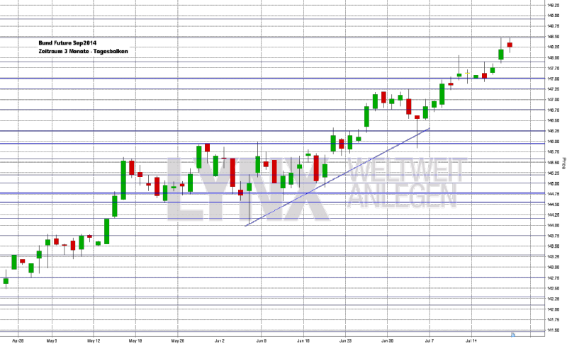 Nochmals konnte der Bund-Future gegen Ende des Freitagshandels ein neues Hoch bei knapp 148,50 markieren. Der vor dem Anstieg erwartete Rücksetzer blieb weitestgehend aus, somit ergaben sich nur wenige gute Einstiegsmöglichkeiten. Der Freitagsschlusskurs lag im Bereich 148,25 was die Handelswoche einmal mehr als sehr stark erscheinen ließ. Weiterhin lässt der Long-Trend keine Zweifel aufkommen, und auch in der kommenden Handelswoche könnten Kurse oberhalb von 147,50 als vorteilhaft für die Käuferseite gewertet werden. Einstiege mit einem gesunden Chance-Risiko-Verhältnis sollten jedoch weiterhin nach leichten Rücksetzern gesucht werden – Beispiele hierfür wären die eingezeichneten Unterstützungen. Die Short-Seite ist in dem aktuell starken Aufwärtstrend nur schwer bis gar nicht umsetzbar und aus diesem Grund nicht zu empfehlen.
