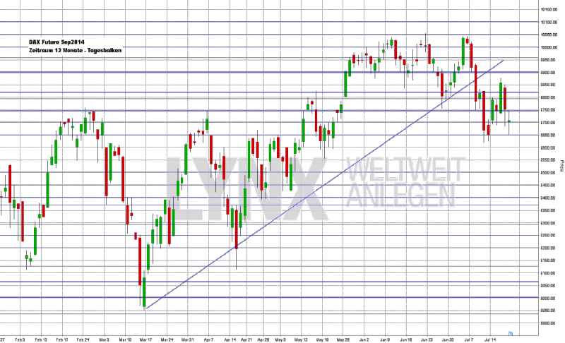 In der abgelaufenen Handelswoche durchlebten die Anleger eine Achterbahn der Gefühle. Am Ende gewann der deutsche Leitindex DAX auf Wochensicht dann doch noch 0,56 Prozent und schloss mit einem Punktestand von 9.720,02. Der XDAX stand um 22:00 Uhr mit 9.737,40 Punkten nochmals deutlich höher. An der Wall Street ging der Dow Jones mit 17.100,18 Punkten und einem Wochenplus von 0,36 Prozent ebenfalls versöhnlich gestimmt aus dem Handel. Der NASDAQ 100 ging mit 3.939,894 Punkten in das Wochenende – eine Wochenbilanz von –0,05 Prozent. Der breit gefasste S&P 500 schloss mit 1.978,22 Zählern – einem Wochenminus von 0,33 Prozent. Die europäische Gemeinschaftswährung Euro konnte sich bei einem Schlussstand von 1,3524 US-Dollar über die Handelswoche behaupten. Der Preis für eine Feinunze Gold betrug zum Wochenschluss 1.310,20 US-Dollar. Rohöl der Nordseesorte Brent verbilligte sich auf 107,009 US-Dollar das Fass. Der Euro-Bund-Future stieg wieder deutlich an und notierte an der EUREX zum Schluss mit 148,25 Zählern. Die Rendite für zehnjährige Bundesanleihen fiel somit auf 1,15 Prozent und hat damit beinahe die Rekordtiefs (1,125/1,13 Prozent) aus den Zeiten der Euro-Schuldenkrise erreicht.