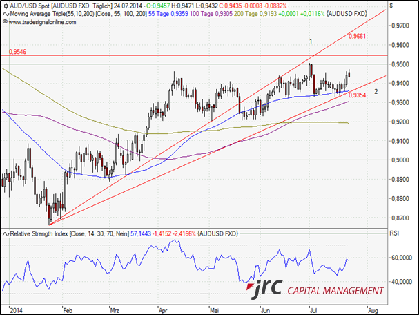 Bei guten Daten aus Australien könnte der Aussie wieder zu alter Stärke zurückfinden und seine Aufwärtsbewegung fortführen. Die psychologisch wichtige Marke von 0,95, die bereits Anfang Juli getestet wurde, wäre dabei der erste Widerstand, den es nachhaltig zu brechen gilt, um einen Aufwärtstrend zu bestätigen. Anschließend läge der nächste Widerstand bei 0,9546 – eine Marke, die im letzten Jahr zweimal getestet wurde.