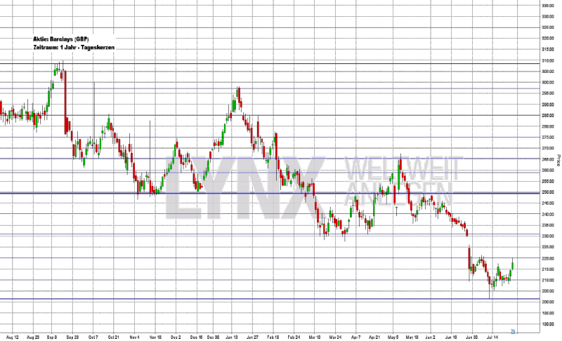 Die Barclays PLC – auch als Barclays Bank bekannt (Börsenkürzel: BCY/ISIN: GB0031348658) – ist ein international agierendes Finanzinstitut im Bereich Geschäfts- und Investmentbanking mit Sitz in London, Churchill Place1. Privatkundengeschäft, Geschäftsbanking, Kreditkartengeschäft, Vermögens- und Investmentmanagement – bei Barclays kann man auf eine globale Expertise zurückgreifen. Die Bank ist in allen wichtigen Geschäftszentren aller Kontinente vertreten. Sie kann dabei auf über 300 Jahre Firmenhistorie verweisen. Man ist in über 50 Ländern aktiv und mit rund 140.000 Mitarbeitern eine internationale Größe. Barclays unterteilt sich in die Barclays PLC Holding, die über dem operativen Geschäft der Barclays PLC angesiedelt ist. Diese ist in fünf Geschäftsbereiche gegliedert, nämlich Personal & Corporate Banking, Barclaycard, Africa Banking, Investment Bank und Barclays Non-Core. Barclays ist international mit sehr guten Bonitätseinstufungen durch die bekannten Ratingagenturen ein verlässlicher Partner. S&P bewertete Barclays PLC mit A (negative) / A-1, Moody’s mit A2 (negative) /P-1 und Fitch mit A (stable) / F1. Das Institut verfügt über Liquidität in Höhe von 134 Mrd. GBP, die zu 84 Prozent in bar, bei Zentralbanken oder in Staatsanleihen hoher Qualität gehalten werden. Das Who-is-Who der Banken- und Investmentbranche, wie zum Beispiel Jefferies, Merrill Lynch, Nomura, Société Générale, S&P Capital IQ, Credit Suisse, HSBC, Morgan Stanley, Independent Research, Citigroup, Macquarie Bernstein, JPMorgan, Exane BNP, Goldman Sachs, UBS und die Deutsche Bank geben der britischen Konkurrenz größtenteils gute Noten. Die Analysen des Jahres 2014 weisen einen deutlichen Überhang auf der Käuferseite aus, elf Analysen raten zum Kauf beziehungsweise zum Übergewichten, fünf Analysen sehen die Aktie neutral, und es gibt keine Verkaufsempfehlung für das Papier von Barclays. Die Kurszielangaben erfolgen in britischen Pence (GBp). Die Kurszielspanne reicht von 360 Pence (Jefferies im Februar) bis 225 Pence (Exane BNP im Juli). Kumuliert ergäben die Analysen ein Durchschnittskursziel von 286 Pence. Die Aktie von Barclays ging am Freitag mit einem Kurs von 218,05 GBp an der LSE (London Stock Exchange) aus dem Handel. Damit wird die britische Bank an den Märkten mit einer Marktkapitalisierung von 3,57 Billionen GBp (bzw. 35,7 Mrd. GBP, die bei derzeitigem EUR/GBP-Wechselkurs rund 44,83 Mrd. Euro entsprechen) bewertet. Die Aktie der Barclays PLC notierte an der LSE auf 52 Wochen-Basis mit einem Hoch bei 296,50 GBp und einem Zwischentief bei 207,90 GBp. Größte institutionelle Investoren sind Crest Nicholson Holdings mit 8,64 Prozent, BlackRock mit 7,06 Prozent, Nexus Capital Investing mit 7,02 Prozent, Qatar Holdings mit 6,65 Prozent, Capital Group Companies mit 4,02 Prozent und Legal & General Group mit 3,99 Prozent. Der Streubesitz liegt bei 62,46 Prozent. Gemäß der Gewinn- und Verlustrechnung (GuV) lag das Ergebnis der gewerblichen Geschäftstätigkeit 2013 bei 2,868 Mrd. GBP. Bilanziert wird bei Barclays nach IFRS in britischen Pfund (GBP). Das Beteiligungsergebnis lag bei -56 Mio. GBP, der Jahresüberschuss bei 540,0 Mio. GBP. Die Jahresüberschüsse von Barclays gingen in den letzten Jahren deutlich zurück. Von dem Rekord aus dem Jahr 2009, 9,4 Mrd. GBP, ist Barclays Lichtjahre entfernt. Selbst die 3,6 oder 3,0 Mrd. GBP von 2010 und 2011 wirken unrealistisch. 2012 lag der Jahresüberschuss bei -1,0 Mrd. GBP. Das Netto-Ergebnis je Aktie lag 2013 bei 0,2104 GBP, die Dividende je Stammaktie bei 0,0821 GBP (trotz gegenläufiger Ergebnisse wurde die Dividende sukzessive angehoben – 2009 hatte sie noch bei 0,0316 GBP gelegen). Für Barclays arbeiteten 2013 139.600 Mitarbeiter. Seit Jahren verringert sich die Anzahl der Beschäftigten. Im Jahr 2009 waren noch 153.800 Mitarbeiter bei Barclays beschäftigt. Die Bilanz für 2013 weist liquide Mittel in Höhe von 45,7 Mrd. GBP auf, 55,4 Mrd. GBP an wirtschaftlichem Eigenkapital, 4,0 Mrd. GBP an gezeichnetem Kapital, 1,2 Bill. GBP an Verbindlichkeiten und 54,8 Mrd. GBP an Verbindlichkeiten gegenüber Kreditinstituten. Die Bilanzsumme liegt damit bei 1,3 Bill. GBP. In den letzten Jahren hat sich die Bilanzsumme leicht reduziert (2011 lag sie noch bei 1,6 Bill.). Dies ist nicht ungewöhnlich. Auch bei anderen Großbanken und Investmentbanken ist eine geringere Bilanzsumme im Vergleich zu den Vorjahren zu erkennen. Verschlankungen, Reduzierungen von Risikopositionen und der Druck durch Basel III sind hier als Gründe anzuführen. Die Umsatzzahlen in den Bilanzprognosen könnten sich für 2014 und 2015 unterschiedlich entwickeln. 2014 könnte es im Vergleich zu 2013 noch einen Rückgang auf 26,91 Mrd. GBP geben, 2015 wären 27,32 Mrd. GBP realistisch. Das EBIT für 2014 läge bei 9,20 Mrd. GBP, 2015 könnten es 10,28 Mrd. GBP sein. Die Dividende je Aktie könnte 2014 bei 7,50 GBp liegen und 2015 auf 10,8129 GBp angehoben werden. Wie auch andere Großbanken litt der Aktienkurs in der jüngeren Vergangenheit durch die globale Finanz- und Schuldenkrise und immer wieder aufkommende Skandale (darunter das Libor- und Goldpreis-Fixing). Im Vergleich zu den beiden Wettbewerbern aus Frankfurt (DBK und CBK) sieht die Fünf-Jahres-Performance mit einem Minus von rund 25 Prozent noch halbwegs erträglich aus (DBK: ca. -40 Prozent / CBK: ca. -63 Prozent). Am 30.07. legt Barclays seine aktuellen Quartalszahlen vor.