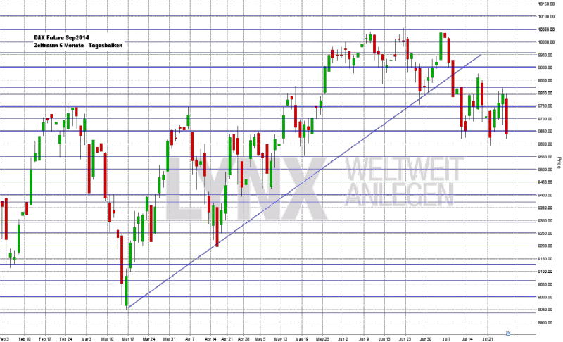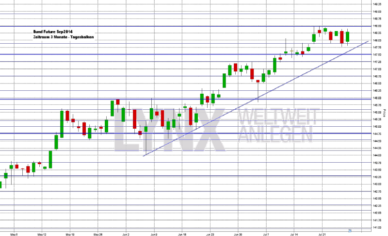 Der Donnerstag beginnt mit dem GfK-Verbrauchervertrauen Juli für Großbritannien um 01:05 Uhr und setzt sich um 03.30 Uhr mit den australischen Baugenehmigungen für den Mai, den australischen Krediten an den Privatsektor im Juni, den japanischen durchschnittlichen Nettoeinkommen im Juni und den australischen Importpreisen für das zweite Quartal fort. Um 05:00 Uhr werden Daten zur neuseeländischen Geldmenge M3 im Juni publiziert. Die japanischen Baubeginne im Juni sowie die Auftragseingänge des Bausektors im Juni werden um 07:00 Uhr ausgegeben. Die deutsche Erwerbstätigenzahl für den Juni und der deutsche Einzelhandelsumsatz im Juni werden zeitgleich mit dem britischen nationalen Hauspreisindex für den Juli um 08:00 Uhr veröffentlicht. Die französischen Konsumausgaben und Erzeugerpreise (beide Juni) folgen um 08:45 Uhr. Die deutschen Arbeitsmarktdaten mit der Arbeitslosenquote für den Juli werden um 09:55 Uhr erwartet. Für die Arbeitslosenquote werden 6,50 Prozent prognostiziert. Die italienische Arbeitslosenquote für den Juni trifft parallel zu dem VDMA-Auftragseingang des deutschen Maschinenbaus für den Juni um 10:00 Uhr ein. Um 11:00 Uhr folgen noch die italienischen Verbraucherpreise, zeitgleich mit der Arbeitslosenquote der Eurozone im Juni und den Verbraucherpreisen der Eurozone im Juli. Die italienischen Erzeugerpreise für den Juni folgen um 12:00 Uhr. Die US-Challenger-Stellenstreichungen für den Juli werden um 13.30 Uhr publiziert. Die Erstanträge und fortgesetzten Anträge auf Arbeitslosenhilfe werden im gemeinsamen Datenstrang mit dem kanadischen BIP für den Mai und dem US-Arbeitskostenindex für das zweite Quartal ausgewiesen. Um 15:45 Uhr wird der Chicago-Einkaufsmanagerindex für den Juli ausgegeben. Am späteren Abend um 21:00 Uhr werden die US-Agrarpreise für den Juli und um 22:30 Uhr die aktuelle Fed-Bilanz für den Juni veröffentlicht. Über 150 Unternehmen berichten von ihren aktuellen Zahlen, darunter VW (D), Siemens (D), Fresenius SE (D), Metro (D), Deutsche Lufthansa (D), Continental (D), aber auch Mastercard (USA), Exxon Mobil (USA), Sony (J), Eni (I), Telefonica (E) und GDF Suez (F).
