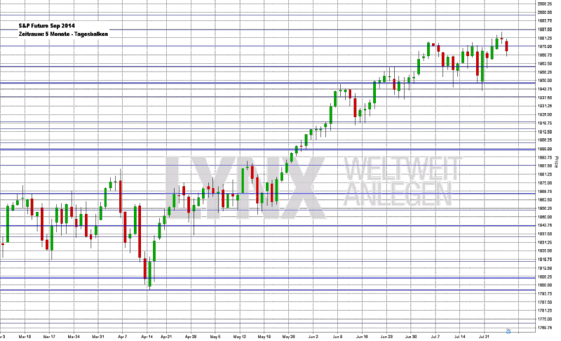 Ab Dienstag konnte der S&P-Future jetzt die erwarteten neuen Hochs erzielen, und ein neues Allzeithoch bei rund 1.987 Punkten wurde markiert. Peu à peu nähert sich der Markt somit der Marke von 2.000 Zählern. Der Schlusskurs von Freitag lag bei gut 1.970 Punkten, was charttechnisch weiterhin voll zu dem vorherrschenden Long-Modus passt. Auch wenn die neuen Hochs nur leicht über den vorherigen liegen, befindet sich der Markt weiterhin im Long-Modus. Ab den Marken 1.960 beziehungsweise 1.950 sollten jedoch die Achtungszeichen etwas größer werden, da ein etwas stärkeres Absacken nicht auszuschließen ist. Long-Trades sollten somit auch nicht mit der höchstmöglichen Intensität umgesetzt werden. Etwas mehr Vorsicht ist ratsam. Generell sind aber neue Hochs und gegebenenfalls auch das Erreichen der 2.000-Punkte-Marke nicht auszuschließen.