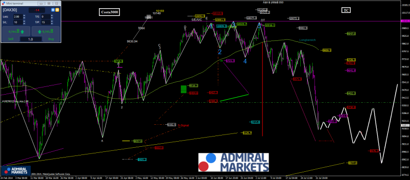 Die vergangene DAX-Handelswoche hatte es in sich: Minus 4,5 Prozent auf Wochensicht hatten wir schon länger nicht mehr erlebt. In den ersten drei Handelstagen bewegte sich der Index in einem Boxbereich zwischen 9.560 und dem Wochenhoch bei 9.705 Punkten. Am Montag der vergangenen Handelswoche hatte er einen Durchbruch durch die Nackenlinie der mittleren SKS-Formation versucht, konnte jedoch die Bewegung nicht umsetzen und kehrte auf das obere Niveau zurück, um am Donnerstag mit einem dynamischen Durchbruch die finale Abwärtsbewegung einzuleiten. Das Niveau um die 9.450-Punkte-Marke – hier lag das maximale Korrekturpotenzial des tertiären Trends – konnte nur kurzzeitig gehalten werden; anschließend fiel das Börsenbarometer bis in den Bereich um 9.390 Punkte. Am Freitag setzte sich mit Beginn des Börsenhandels weiterhin die Abgabeseite durch und ließ den DAX das anvisierte Ziel der SKS bei 9.315 Punkten erreichen. Weiterer Abwärtsdruck führte ihn im nachbörslichen Handel zu seinem Wochentief bei 9.150 Punkten, bevor zum Wochenschluss im Bereich um 9.185 Punkte eine Stabilisierung einsetzte. Für die starke Abwärtsbewegung waren die Konflikte im Nahen Osten sowie der Ukraine verantwortlich.