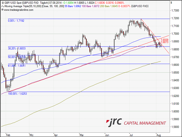 Sollte es sich beim Bruch der Trendlinie, ausgehend vom Februar diesen Jahres, um einen Fehlausbruch handeln, der Kurs am 38,2-Prozent-Fibonacci-Retracement abprallen und seinen Aufwärtstrend fortführen, so wäre die 100-Tage-Linie zusammen mit der Abwärtstrendlinie der erste Kreuzwiderstand auf dem Weg nach oben. Derzeit befinden diese sich bei 1,6872/1,6873. Im weiteren Verlauf sind es die primäre Trendlinie, die Ende Juli gebrochen wurde, und die 55-Tage-Linie bei 1,6939 beziehungsweise 1,6962, welche als Widerstand fungieren könnten. Auf lange Sicht dürfte die 1,72er-Marke der wichtigste psychologische Gegner der Bullen sein.