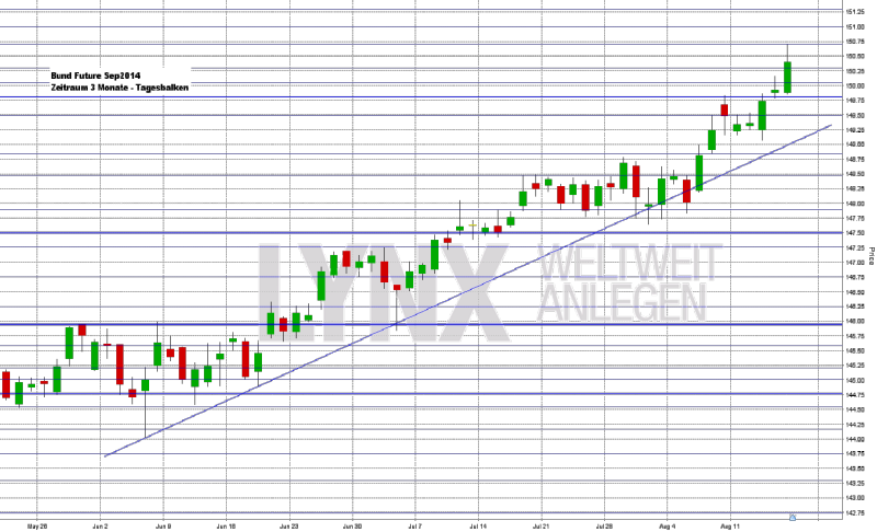 Sehr klar und ohne Zweifel setzte sich die angepeilte Long-Seite auch in den letzten fünf Handelstagen durch und der Bund-Future erreichte ohne große Probleme mehrfach neue Allzeithochs. Mit dem Freitagshandel bremste der Markt dann zunächst kurz vor der Marke von 150,75 Punkten, was auch den höchsten Kurs der Woche darstellte. Der Freitagsschlusskurs lag dann nur geringfügig unter dem Hoch im Bereich von 150,35 Punkten. Die aggressive Short-Idee an der 150-Punkte-Marke musste mit einem leichten Minus geschlossen werden. Der mittlerweile schon historische Lauf des Bund-Futures sollte auch in den kommenden Tagen nicht zwingend zum Erliegen kommen. Der Trend ist weiterhin klar long und Kurse über der eingezeichneten Trendlinie unterstützen diese Annahme. Long-Trades an Unterstützungen sollten somit weiterhin positive Ergebnisse liefern. Die Short-Seite stellt aus aktueller Sicht keine Option dar.