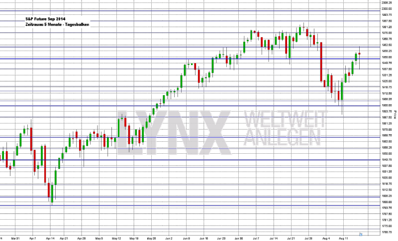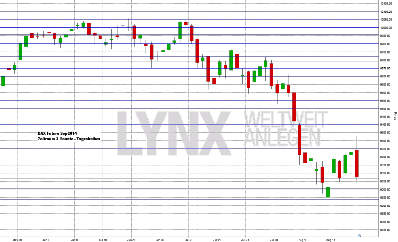 In der neuen Börsenwoche werden einmal mehr US-Daten ganz oben auf der Agenda der Händler stehen. Besonders das FOMC-Protokoll, US-Immobilienmarktdaten, die US-Verbraucherpreise und vor allem das Symposium in Jackson Hole werden die Marktteilnehmer verfolgen. Es geht wieder einmal um die US-Zinserhöhungsdebatte. Wann könnten die Zinsen erhöht werden? Welche Hinweise oder auch zwischen den Zeilen versteckten Andeutungen werden Janet Yellen und ihre Amtskollegen in Jackson Hole liefern? Gerade die US-Häusermarktdaten, der Philly-Fed-Index oder weitere Indizes könnten geldpolitische Indikationen liefern und den Prozess des „Tapering“ um die Aussicht auf eine erste Zinsanhebung ergänzen. Noch preisen die Terminmärkte die erste US-Zinserhöhung (30 Day Federal Funds Futures Quotes) für die Monate September/Oktober 2015 ein. Ein geändertes Wort in der „forward guidance“ von Frau Yellen und ihren Kollegen und schon könnte dies ganz anders aussehen. Droht den Märkten kein zusätzliches geopolitisches Ungemach vonseiten des ukrainischen Bürgerkrieges beziehungsweise der Ukraine-Russland-Krise, der IS im Irak und Syrien, aus Israel/Gaza oder von anderen Brennpunkten der Welt, so könnten zumindest die US-Märkte von Montag bis Mittwoch an Wert zulegen. Die europäischen Märkte – allen voran der DAX – nehmen in Bezug auf Russland eher eine Sonderrolle ein. Der deutsche Leitindex könnte sich auch weiter leicht konträr zu den anderen Märkten entwickeln.