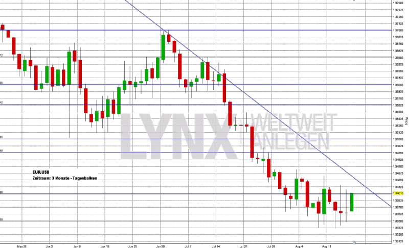 Am Freitag setzt sich das Jackson-Hole-Symposium fort. In Europa bleibt der Datenkalender ohne Meldungen, nur die wöchentlichen LTRO-Rückzahlungen an die EZB um 12:00 Uhr werden ausgegeben. Zum Nachmittag überwiegen kanadische Daten mit den Verbraucherpreisen für den Juli und den Einzelhandelsumsätzen für den Juni um 14:30 Uhr. Spät am Abend um 20:30 Uhr wird eine Rede von EZB-Präsident Mario Draghi in Jackson Hole erwartet. Der wöchentliche COT-Report der CFTC kommt um 21:30 Uhr. An der Unternehmensfront erreichen die Händler unter anderem Quartalsergebnisse von Foot Locker (USA), Tradegate Exchange (D), der Royal Bank of Canada (CDN) und rund 25 weiteren Konzernen.