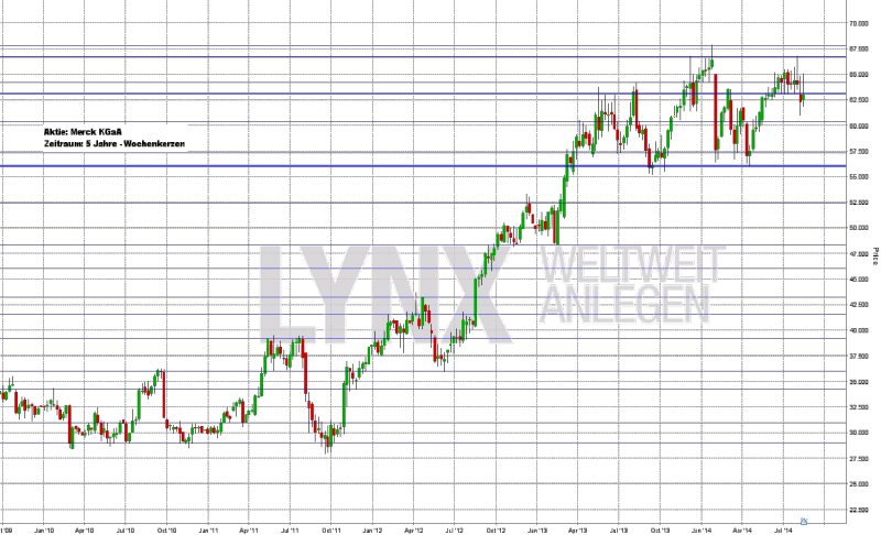Seit Oktober 2011 hat sich die Aktie von Merck KGaA (Börsenkürzel: MRK / ISIN: DE0006599905) sehr gut entwickelt. Von Tiefkursen im Bereich um die Marke von 28,00 Euro konnte sie sich bis zum Hoch von rund 67,80 Euro heraufarbeiten. Seit nunmehr rund einem Jahr hat sich die vorher sehr saubere Aufwärts-Chartbewegung in eine etwas unsauberere verwandelt, und der Verlauf war eher seitwärts mit Aufwärtstendenz. Der aktuelle Schlusskursbereich liegt bei 63,00 Euro, was prinzipiell als stark einzustufen ist. Generell lässt sich der Vorteil der Aktie von Merck KGaA weiterhin klar in der Long-Richtung wiederfinden. Die erwähnte Seitwärtsphase sollte jedoch etwas zur Vorsicht aufrufen und verlangt nicht unbedingt den aggressivsten Trading-Stil. Ideal wäre ein erneuter Anstieg über den aktuellen Schlusskursbereich von rund 63,00 Euro, was in der Folge durchaus zu neuen Hochkursen führen könnte. Kurse zwischen 63,00 und 56,00 Euro sind von der Tendenz ebenfalls als long zu werten, wobei das Gesamtbild hier eher einer Seitwärtsphase gleichen würde. Short-Trades sollten aktuell keine Rolle spielen, erst ein Unterschreiten der Marke von 56,00 Euro könnte gegebenenfalls für Short-Szenarien genutzt werden.