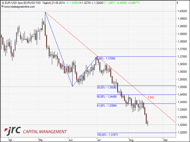 Sollte der Kurs drehen, dürfte die Marke von 1,33 US-Dollar pro Euro der erste Widerstand sein. Bei einer mittelfristigen Korrektur würde der Bereich um 1,3450 als nächster Widerstand der Bullen gelten. Auf lange Sicht müsste das Hoch der letzten Korrekturbewegung bei 1,3700 überboten werden, um aus charttechnischer Sicht sagen zu können, dass der Abwärtstrend gestoppt sei.