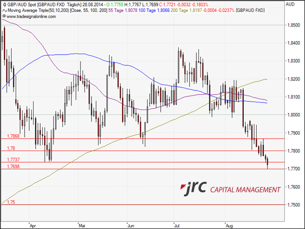 Am heutigen Handelstag, dem 28. August 2014, wurde ein neues Jahrestief markiert. Nach dem Test der 1,77er-Marke hat der Kurs etwas nach oben korrigiert und notiert derzeit bei 1,7721 Australischen Dollar pro Britischem Pfund. Sollte es sich um einen Fehlausbruch handeln und somit der Seitwärtstrend noch intakt sein, könnte der Kurs bis zur 1,78er-Marke steigen, wo er seinen ersten psychologischen Widerstand findet. Der nächste Widerstand dürfte beim letzten Fraktal bei 1,7868 liegen. Langfristig wäre im Rahmen des Seitwärtstrends auch ein Anstieg über 1,8300 denkbar.