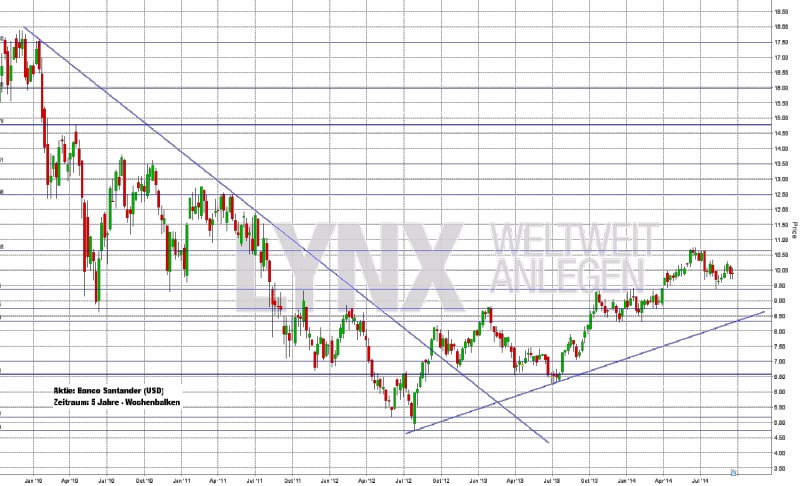 Im 5-Jahres-Rückblick auf die Aktie von Banco Santander (Börsenkürzel: SAN (NYSE) bzw. BSD2 (Xetra) / ISIN: ES0113900J37) lassen sich zwei Phasen festmachen. Zum einen ging es bis zum August 2012 in einem kontinuierlichen Abwärtstrend nach unten, seitdem jedoch langsam, aber stetig, wieder nach oben. Neben zahlreichen anderen Unterschieden dieser beiden Trends lässt sich unter anderem der Volatilitätsunterschied hervorheben. Der Abwärtstrend war durchschnittlich stärker volatil als der aktuelle Aufwärtstrend, was gerade für das Stopmanagement eine größere Rolle spielt. Seit circa zwei Jahren konnte sich der Wert um gut 5,00 US-Dollar auf aktuell rund 10,00 US-Dollar hinauf arbeiten, was einem Plus von 100 Prozent entspricht. Die Aktie sollte jetzt auch weiterhin aus dem Long-Blickwinkel betrachtet werden. Erst ein Unterschreiten der Aufwärtstrendlinie beziehungsweise der Marke von 8,50 US-Dollar würde das saubere Aufwärtstrendbild unterbrechen, dann wäre Vorsicht geboten. Shorttrades sind aus aktueller Sicht keine Überlegung wert. Ein Kauf im aktuellen Kursbereich um die Marke von 10,00 US-Dollar wäre ein denkbares Szenario da es recht gute Stopppunkte gibt und eine Weiterführung des Trends in Richtung 11,50 US-Dollar / 12,00 US-Dollar als durchaus realistisch betrachtet werden könnte.
