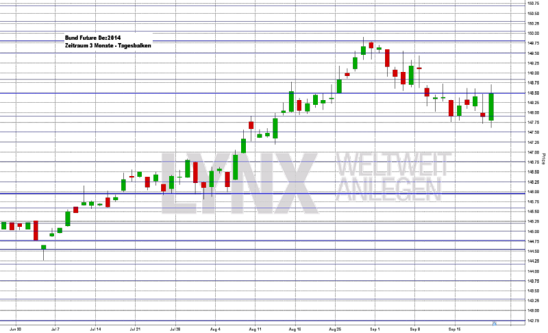 Überwiegend bewegte sich der Bund-Future in den vergangenen fünf Handelstagen unter der Marke von 148,50, das gestattete es, die eine oder andere Short-Idee umzusetzen. Das Wochentief lag im Bereich um die Marke 147,60 und der Schlusskurs zum Freitagabend dann direkt an der wichtigen Marke von 148,50. Die letzten Handelstage gaben nicht wirklich viel Aufschluss über die Richtungsentscheidung des Bund-Futures. Es bleibt somit nur, am Markt mit großer Vorsicht zu handeln, da ein eindeutiger Trendvorteil aktuell nicht erkennbar ist. Mit dem einen oder anderen Trade könnte vorsichtig weiterhin unter der Marke von 148,50 die Short-Richtung in Betracht gezogen werden, über dieser Marke die Long-Richtung, die als realistisches Ziel 149,25 erreichen könnte.