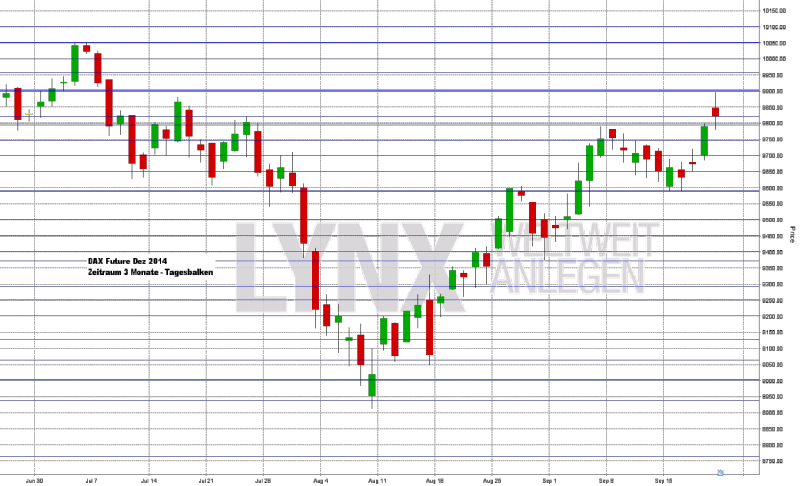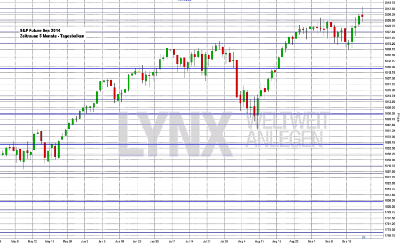 Am Montag der vergangenen Woche hielt sich der S&P-Future noch unter der Marke von 1.980,00 Zählern auf und eine Short-Idee schloss plus/minus null. Ab Dienstag entwickelte sich der Markt dann recht zügig über den Bereich von 1.980. Longtrades in Richtung neuer Allzeithochs brachten Gewinne. Aktuell liegt das Allzeithoch im S&P-Future (Dez2014-Kontrakt) jetzt bei rund 2.013 Zählern. Der Schlusskurs war am Freitag dann das vorherige Ausbruchsniveau im Bereich um die Marke von 2.005. Kurse über der Marke von 1.987,50 haben weiter den Long-Vorteil, Shorttrades sollten keine Rolle spielen. Weitere neue Hochs sind nicht auszuschließen. Leichte Kursrücksetzer wären ideale Einstiegspunkte für die Long-Seite. Deshalb sollte primär nach ihnen Ausschau gehalten werden.