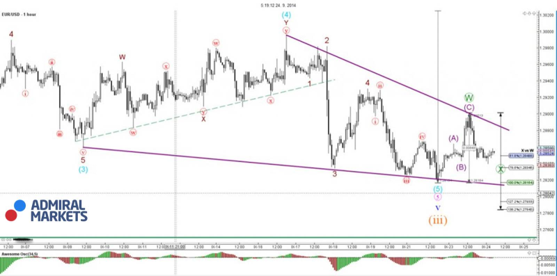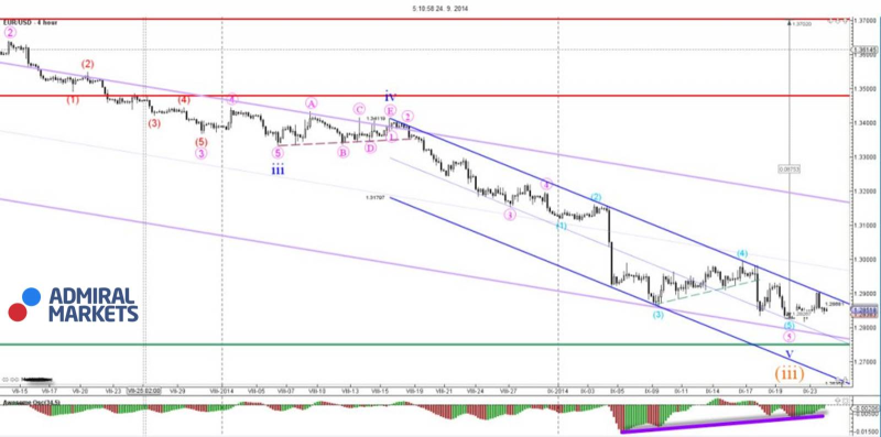 Auf dem Oszillator beobachten wir eine Divergenz (purpurne Linie), während der Kurs die Widerstandlinie des Trendkanals (blau) erreicht hat. Die wichtigste Frage hierzu lautet: Folgt eine Korrektur im Rahmen der Welle 4 (orange) oder eine weitere Abwärtsbewegung?