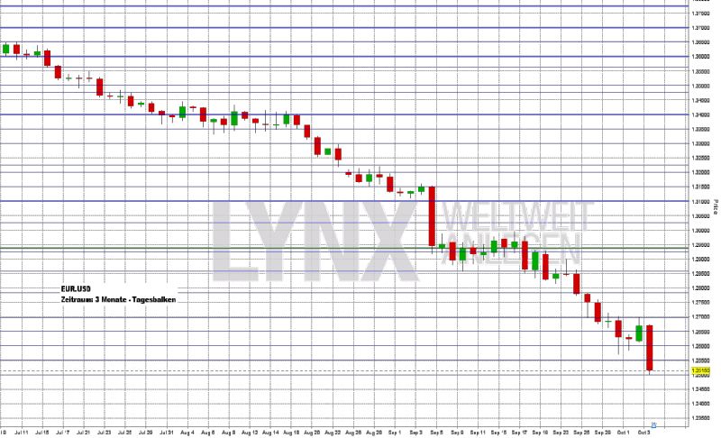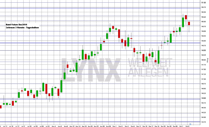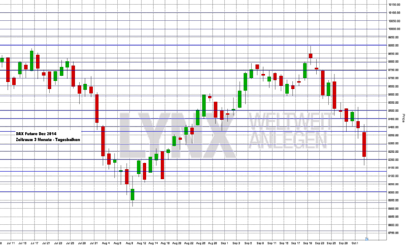 In der abgelaufenen Handelswoche verlor der deutsche Leitindex DAX massiv – vor allem nach der EZB-Pressekonferenz am Donnerstag. Die EZB legte ihren Plan zum Ankauf von „Covered Bonds“ und „ABS“ vor – insgesamt soll die EZB-Bilanz sich wieder signifikant aufblähen und Rekordwerte aus dem Jahr 2012 wieder erreichen. Mit einem Wochenverlust von 3,31 Prozent ging der DAX am Donnerstag bei 9.195,68 Punkten aus dem Xetra-Handel und ins verfrühte Wochenende. Der X-DAX notierte dann um 22:15 Uhr mit 9.224,58 Punkten wieder etwas freundlicher. Der Dow Jones schloss am Freitag an der Wall Street nach den US-Arbeitsmarktdaten für den September deutlich positiv mit 17.009,69 Punkten und verringerte sein Wochenminus auf 0,60 Prozent. Der NASDAQ 100 beendete die Woche an der Technologiebörse NASDAQ bei 4.027,307 Punkten, das Wochenergebnis lag auch hier mit 0,65 Prozent noch leicht im Minus. Der S&P 500 schloss die Handelswoche mit 1.967,90 Punkten und einem Minus von 0,75 Prozent ab. Die Feinunze Gold gab auf Wochensicht um 2,31 Prozent nach und kostete zum Handelsschluss 1.192,05 US-Dollar. Rohöl der Nordseesorte Brent stand bei 92,10 US-Dollar pro Fass, damit setzte sich der Preiseinbruch weiter fort. Die europäische Gemeinschaftswährung Euro war einmal mehr der Verlierer der Handelswoche und gab auf Wochensicht um 1,35 Prozent nach. Damit notierte der Euro zum Wochenschluss bei 1,2513 US-Dollar. Der Euro-Bund-Future zeigte zum Ende der Woche mit 149,94 Zählern weiterhin Stärke. Er indiziert damit die zehnjährige Bundesanleihe mit einer Rendite von 0,92 Prozent. Für den Mittwoch nächster Woche plant die deutsche Finanzagentur eine Auktion. Es werden fünfjährige „Bobl“ im Volumen von 4 Mrd. Euro ausgegeben – es handelt es sich um eine Aufstockung.