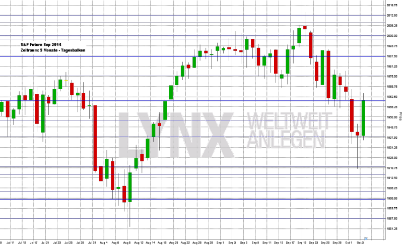 Vorsicht hat sich beim S&P-Future in den vergangenen Tagen mehr als bezahlt gemacht. Gerade ab Mittwoch war die aufkommende Volatilität kaum berechenbar und somit auch nur bedingt handelbar. Zwar war der Vorteil bis zum Donnerstagmittag hauptsächlich auf der Short-Seite, die nötigen Stoppgrößen waren mit einem vernünftigen Risiko- und Moneymanagement jedoch kaum noch zu vereinbaren. Die Wochenschwankung lag bei circa 60 Punkten und der Wochenschluss am Ende im Bereich um die Marke von 1.960,00. Der S&P-Future muss auch weiterhin mit großer Vorsicht betrachtet werden. Größere Stopps sind kaum zu umgehen. Zwar lässt sich jetzt eine Abwärtsbewegung ausmachen, durch das volatile Hin und Her sollten Handlungen sich jedoch idealerweise eher auf andere Märkte konzentrieren.