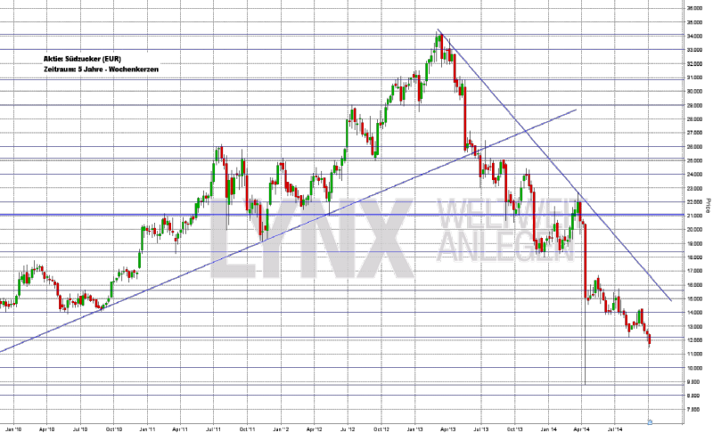 Die Aktie hat sich seit Mitte März 2013 stark negativ entwickelt. Am 08.03.2013 stand sie noch im Hoch bei 34,34 Euro. Innerhalb eines Jahres verlor sie bis dato rund 46 Prozent. Auf 52-Wochen-Basis lag das Hoch bei 24,45 Euro und das Tief bei 11,55 Euro. Die größten Anleger sind die Süddeutsche Zuckerrüben-Verwertungs-Genossenschaft eG mit 52,00 Prozent, die Zucker Invest GmbH mit 10,00 Prozent und BlackRock mit 2,14 Prozent. Der Streubesitz liegt damit bei rund 35,75 Prozent. Die Südzucker AG legt am 09.10.2014 ihren Zwischenbericht für das zweite Quartal vor und am 13.01.2015 den Zwischenbericht zum dritten Quartal.