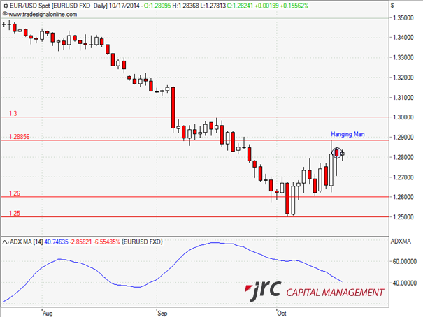 Aus technischer Sicht könnte sich der kurzfristige Aufwärtstrend des EUR/USD dem Ende zuneigen und der Kurs wieder seinen primären Abwärtstrend aufnehmen. So hat sich auf dem Tages-Chart eine Hanging-Man-Reversal-Kerze gebildet und auch der ADX-MA-Indikator, welcher das Momentum einer Bewegung aufzeigt, deutet auf eine Drosselung der Trendstärke hin.