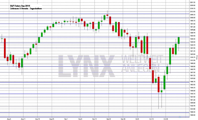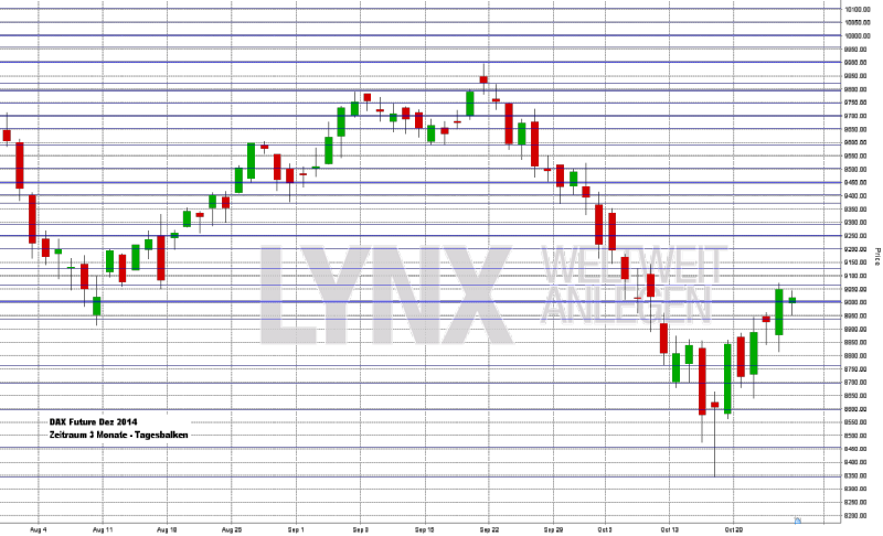 Das übergeordnete Bild einer Seitwärtsbewegung bleibt weiter intakt. Das Jahr 2014 beschert dem DAX bis dato eine Performance von -5,91 Prozent. In der abgelaufenen Handelswoche gewann der deutsche Leitindex 1,55 Prozent und schloss mit einem Punktestand von 8.987,80 nur knapp unter der 9.000er-Marke. Der XDAX stand um 22:15 Uhr mit 9.020,56 Punkten zum Wochenschluss wieder deutlich höher. An der Wall Street zeigte sich der Dow Jones mit 16.805,41 Punkten weiter sehr stark – insgesamt erzielte er ein Wochenplus von 2,59 Prozent. Der NASDAQ 100 ging mit 4.042,017 Punkten in das Wochenende – eine Wochenbilanz von unglaublichen +5,94 Prozent! Der breit gefasste S&P 500 schloss nach neuen Rekordständen bei 1.964,58 Zählern – einem Wochenplus von ebenso erstaunlichen 4,12 Prozent. Die europäische Gemeinschaftswährung Euro konnte sich bei einem Schlussstand von 1,2669 US-Dollar über die Handelswoche nicht behaupten und verlor 0,69 Prozent an Wert. Der Preis für eine Feinunze Gold betrug zum Wochenschluss 1.231,15 US-Dollar – ein Wochenverlust von 0,58 Prozent. Rohöl der Nordseesorte Brent verbilligte sich weiter auf 86,13 US-Dollar das Fass. Der Euro-Bund-Future entwickelte sich erneut stark und notierte an der EUREX zum Schluss mit 150,29 Zählern. Die Rendite für zehnjährige Bundesanleihen liegt somit weiter auf niedrigstem Niveau bei 0,89 Prozent. In der neuen Handelswoche begibt die deutsche Finanzagentur am Montag Zwölfmonats-Bubills mit einem Emissionsvolumen von 2 Mrd. Euro (Neuemission) und am Mittwoch zehnjährige Bundesanleihen mit einem Volumen von 4 Mrd. Euro (Aufstockung).