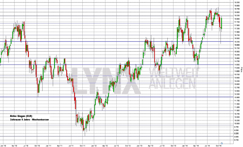Die Bilanzprognosen (Schätzungen in Euro) sprechen für Stabilität. Für 2014 wird ein Umsatz von 1,02 Mrd. Euro erwartet, für 2015 sogar 1,09 Mrd. Euro. Das EBIT soll 2014 auf 263,28 Mio. Euro steigen, 2015 soll es bereits bei 287,62 Mio. Euro liegen. Der Gewinn je Aktie könnte demnach 2014 auf 0,8147 Euro je Stück anwachsen und 2015 sogar bei 0,9044 Euro je Anteilsschein liegen. Auch 2014 und 2015 wird es kaum eine Dividende geben. Die Nettoverschuldung von Qiagen könnte sich zukünftig stark reduzieren. 2014 könnte sie bei 221,25 Mio. Euro und 2015 bei 69,97 Mio. Euro stehen. Qiagen legt am Mittwoch, den 29.10.2014 Zahlen zum dritten Quartal vor. Von den Insidern kommt nur ein kleineres Signal. Der Aufsichtsratsvorsitzende Dr. Werner Brandt hat gemäß der Meldung vom 14.08.2014 5.000 Qiagen-Aktien im Wert von 89.227 Euro am Handelsplatz Frankfurt gekauft. Der Einstiegskurs lag bei 17,8454 Euro.