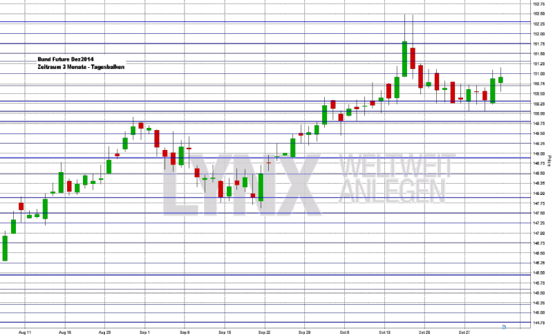 Kaum Bewegung zeigte der Bund-Future in den vergangenen Tagen. Der Bereich 150,30 sowie der knapp über 150,00 brachten wie angenommen etwas Unterstützung für den einen oder anderen Versuch auf der Long-Seite. Erst zum Donnerstag konnte sich der Markt dann etwas weiter nach oben absetzen und ermöglichte einen gewinnbringenden Trade. Der Schlusskurs am Freitagabend lag leicht im Plus bei rund 150,90. Weiterhin bleibt die Long-Richtung aktiv, solange der Markt sich über 150,30 hält. Long-Trades wären somit zu bevorzugen. Nach wie vor bleibt die Short-Richtung eher weniger interessant, solange keine nennenswerten Bewegungen unter 150,30 beziehungsweise 150,00 zu verzeichnen sind. Als Wochenziel auf der Long-Seite sind die Marken 151,50 und 151,75 durchaus als realistisch einzustufen.