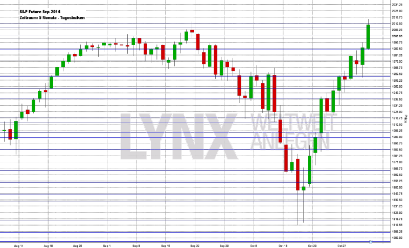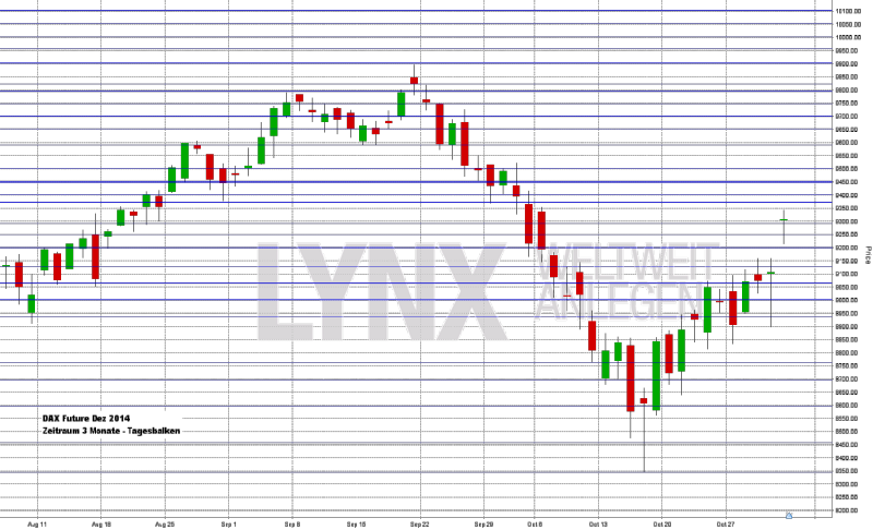 Der deutsche Leitindex DAX gewann auf Wochensicht 3,77 Prozent und schloss mit 9.326,87 Punkten. Die Jahresperformance 2014 liegt mit -2,36 Prozent weiterhin im roten Bereich. Der X-DAX stand um 22:15 Uhr mit 9.319,39 Punkten nur geringfügig tiefer. In der abgelaufenen Handelswoche gab es an den US-Märkten wieder einmal Rekorde zu vermelden. An der Wall Street ging der Dow Jones mit 17.390,52 Punkten und einem Wochenplus von 3,48 Prozent aus dem Handel, erzielte aber in der abgelaufenen Börsenwoche einen neuen Rekordwert von 17.395,54 Punkten. Der NASDAQ 100 ging mit 4.158,211 Punkten in das Wochenende – eine Wochenbilanz von +2,87 Prozent und die zwischenzeitlich erreichten 4.170,84 Punkten sind ebenfalls ein neuer Rekordwert. Der breit gefasste S&P 500 schloss mit 2.018,05 Zählern – einem Wochenplus von 2,72 Prozent. Der Rekordwert des S&P 500 liegt bei 2019,26 Punkten. Die europäische Gemeinschaftswährung Euro verlor mit -0,32 Prozent im Laufe der Woche weiter an Boden und ging mit einem Schlussstand von 1,2524 aus der Handelswoche. Der Preis für eine Feinunze Gold betrug zum Wochenschluss 1.172,05 US-Dollar, ein starkes Wochenminus von 4,75 Prozent. Rohöl der Nordseesorte Brent notierte zum Handelsende bei 85,86 US-Dollar das Fass. Der Euro-Bund-Future zog auf Wochensicht wieder stärker an und notierte an der Eurex zum Schluss mit 151,09 Zählern. Die Rendite für zehnjährige Bundesanleihen beläuft sich entsprechend auf nur noch 0,84 Prozent. Am Mittwoch plant die Finanzagentur des Bundes im Rahmen einer Auktion die Aufstockung eines fünfjährigen „Bobl“ mit der Fälligkeit 11.10.2019 im Umfang von 4 Mrd. Euro.