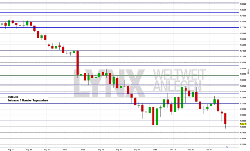 Der Freitag beginnt mit dem Quartalsbericht der RBA (Reserve Bank of Australia) um 01:30 Uhr. Weiter geht es erst in der europäischen Session mit der Arbeitslosenquote für die Schweiz im Oktober um 07:45 Uhr. Die Handelsbilanz aus Deutschland folgt um 08:00 Uhr zeitgleich mit den September-Exportzahlen und den Daten zur Erzeugung des produzierenden Gewerbes im September. Französische Daten zum Handelsbilanzsaldo, zur Staatsfinanzierung und zur Industrieproduktion (alle für September) folgen um 08:45 Uhr. Die Schweizer Devisenreserven im Oktober werden um 09:00 Uhr publiziert. Die spanischen Angaben zur Industrieproduktion für den September kommen um 09:00 Uhr auf die Handelsschirme. Das Treffen der Finanzminister der Eurozone geht ab 09:00 Uhr in seinen zweiten Tag. Der Einzelhandelsumsatz aus der Schweiz für den September wird um 09:15 Uhr veröffentlicht. Die britischen Handelsbilanzdaten für den September sind um 10:30 Uhr zu erwarten. Um 12:00 Uhr werden die wöchentlichen LTRO-Rückzahlungen an die EZB veröffentlicht. Am Nachmittag beginnt um 14:30 Uhr der Datenreigen aus den USA. Das Ereignis der Woche, die US-Arbeitsmarktdaten (Nonfarm Payrolls) für den Oktober, steht ganz oben auf der Agenda der Händler und verdrängt für gewöhnlich die zeitgleich erscheinenden kanadischen Arbeitsmarktdaten Oktober (die kanadische Arbeitslosenquote liegt derzeit bei 6,8 Prozent). Die US-NFP-Daten geben Auskunft über die neu geschaffenen Stellen, die Arbeitslosenquote und die Stundenlöhne. Die Fed-Chefin hält um 16:15 Uhr eine Rede in Paris. Abends um 21:00 Uhr werden noch Zahlen zu den US-Verbraucherkrediten für den September und der aktuelle COT-Bericht der Woche veröffentlicht. Der Unternehmenskalender ist auch am Freitag noch gut gefüllt. Nochmals legen mit Allianz (D) und Swiss Re (CH) zwei große Versicherer Quartalszahlen vor. Ferner berichten Osram (D), Schaltbau (D), freenet (D) und ArcelorMittal (LUX) von ihren aktuellen Zahlen.